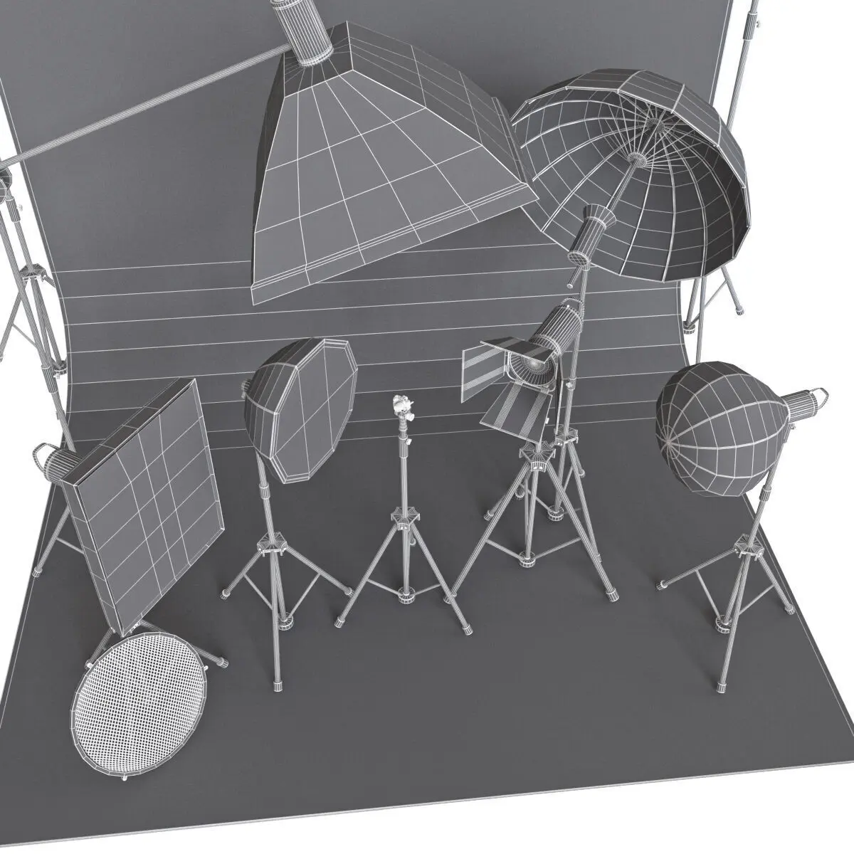 Name: A set of studio equipment 01Type: modelFormat: 3Ds Max 2017Export: OBJRender: Corona (8) Vray(4.x)Polys: 1841718Verts: 923123Units: MillimetersDimension: 6117.21 x 5250.08 x 4456.77