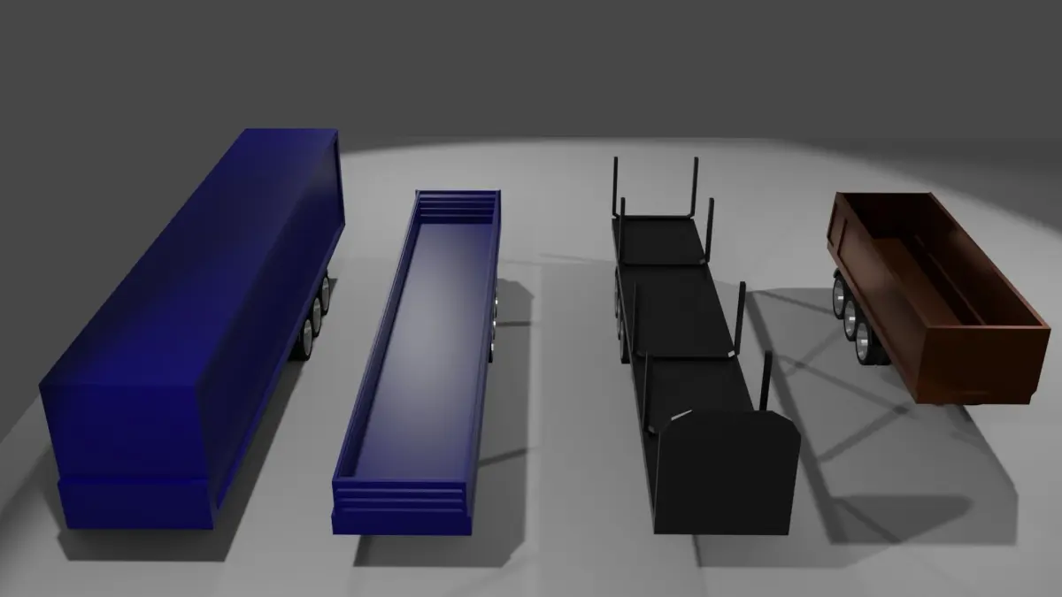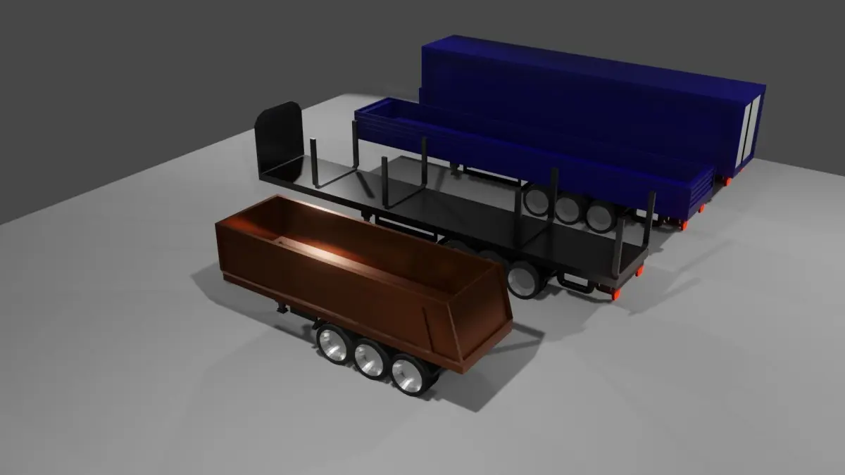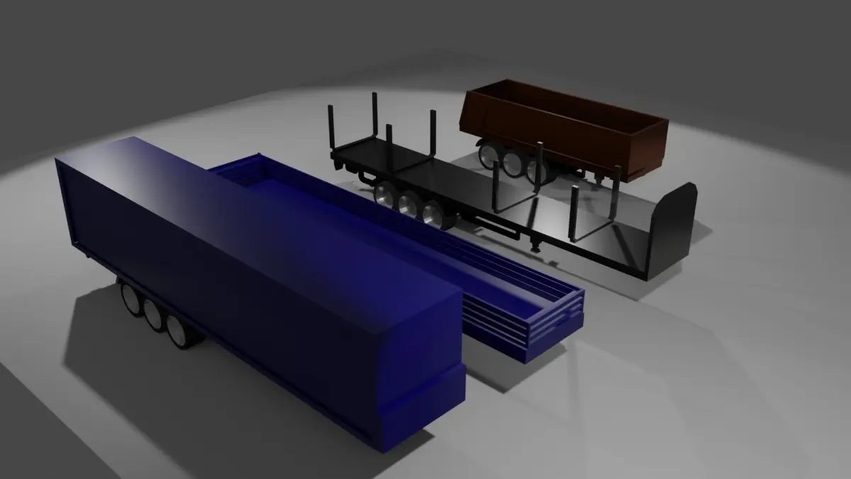 I present to you a set of low-poly trailers, which consists of four trailers :Platform for the forestFlatbed trailerRegular trailerCareer growth