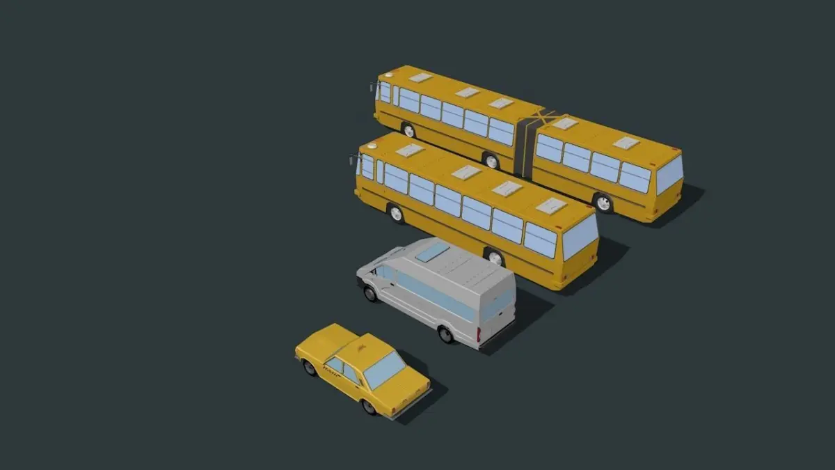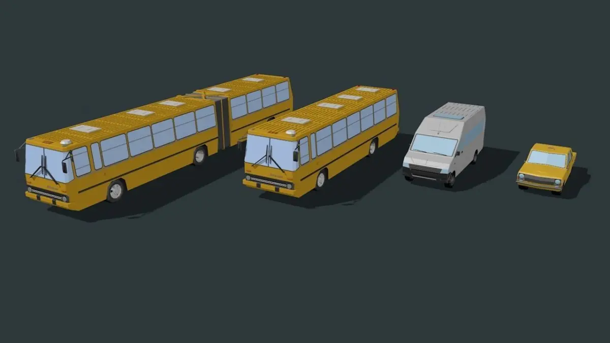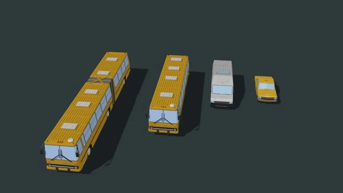 a set of low-poly 3d models of urban passenger transport : passenger car taxi, minibus and city passenger bus IKARUS in two versions