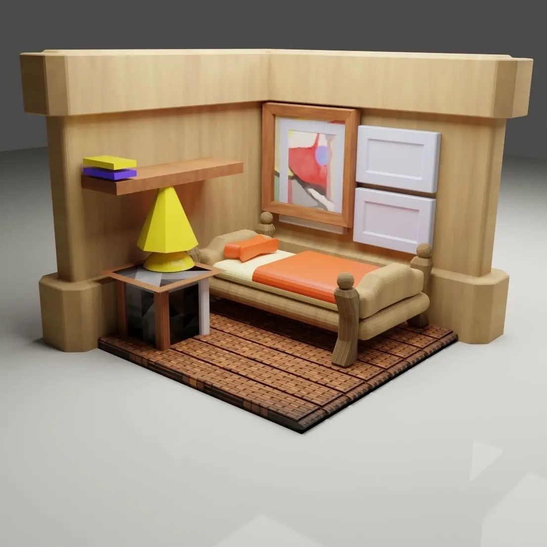 A Simple Bed room 3D model with low poly | Low Poly . It is Made in blender software . In this model A simple room , in which a 3D Bed , a table ,a rack ,a lamp and photo frames and some book and well furnished model . You can use this simple model in any your project . A many type of file extension you can download .blend , .fbx , x3d , .mtl etc.you can review this model in images will be shared.