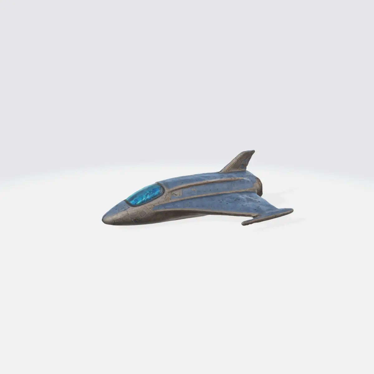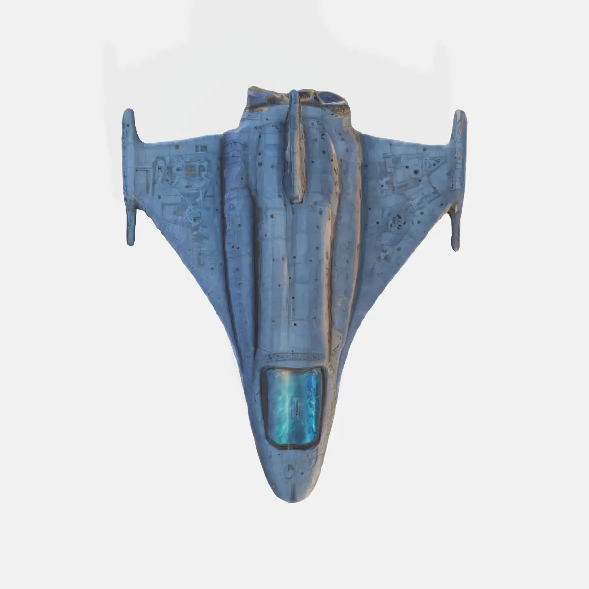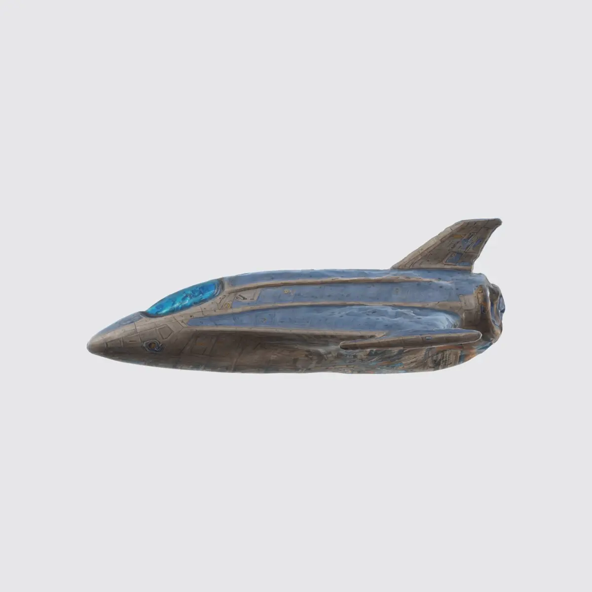 A sleek futuristic blue spacecraft with a distinctive shark-like design