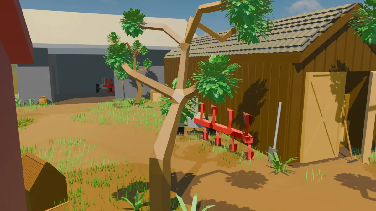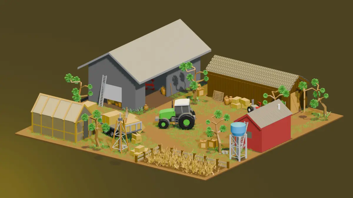 A small farm with one barn, a small hectare of land, a tractor and trailer with bales nearby. Also near the trailer there is a greenhouse, and to the side of it a garage with a plow, and next to it there is a barn with several boxes and a house, near which there is a bags of wheat, between them there is a doghouse, and there is a farm-water.