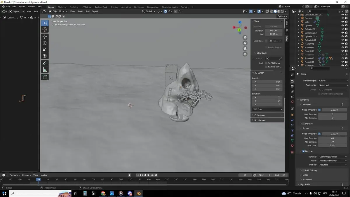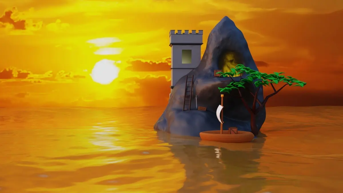 a small island in the middle of a vast body of water, illuminated by the golden hues of the setting sun. A castle tower was built on the rocky terrain of the island; it is gray and strong with a green flag on top. The rock formation is rough and dark, contrasting with the bright sky and reflective waters. A single tree with lush green foliage grows in a patch of grass on one side of the cliff, adding life to the scene. A white bird stands gracefully near a tree, looking at the calm waters that surround this secluded piece of land. The sky is painted in warm tones, varying from yellow to orange, as clouds are scattered across it; below, these colors are reflected in calm waters that stretch to infinity.