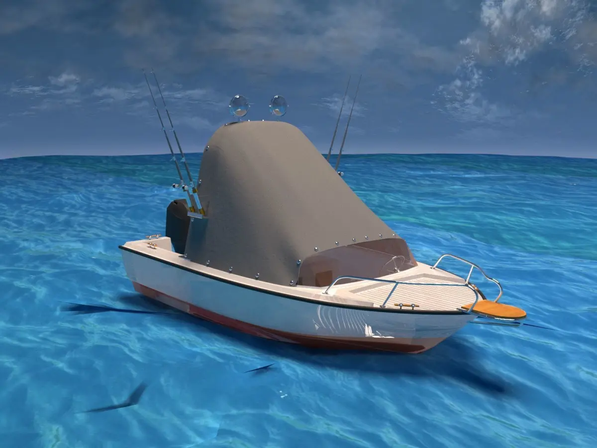 a small motorboat floating on a calm, blue ocean. The boat has a white hull with a red stripe near the waterline and is equipped with fishing rods mounted on the back. There is a metal frame structure on the boat, possibly for supporting a canopy or for attaching additional equipment. The boat appears to be designed for recreational fishing or leisure activities on the water. The scene is serene, with gentle waves and a clear sky, making it an inviting setting for a day out on the sea.