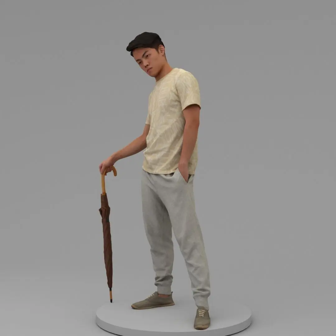 A strong young man with standing alone with umbrella and looking along