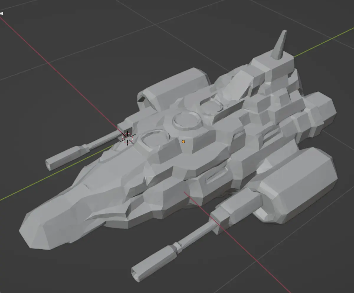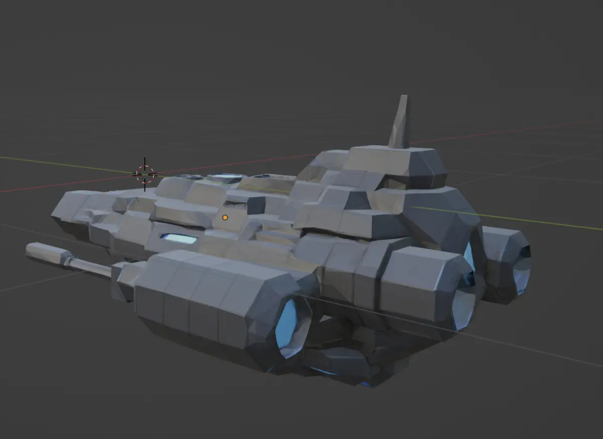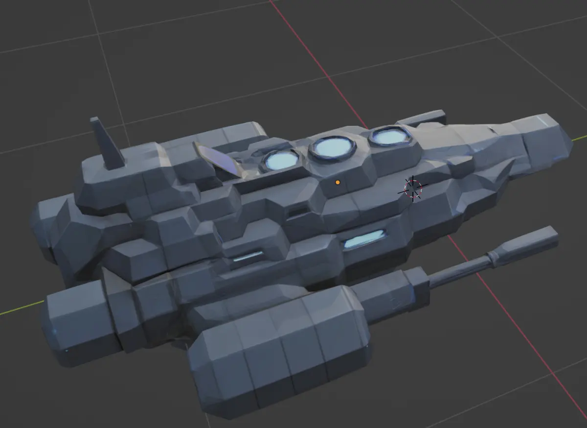 A stylized low-poly 3D space warship designed for a sci-fi video game. The ship features a sleek, elongated body with angular hull segments, large rear thrusters, side-mounted plasma cannons, and antenna arrays. The surface is detailed with sci-fi panel lines, glowing blue energy cores, and vent systems. The overall design blends elements of a cruiser and a stealth ship. The color scheme includes dark grey, matte black, and electric blue lighting. Exaggerated proportions suitable for stylized games. Designed for real-time rendering and .obj export. Perspective: angled top-down or side view."