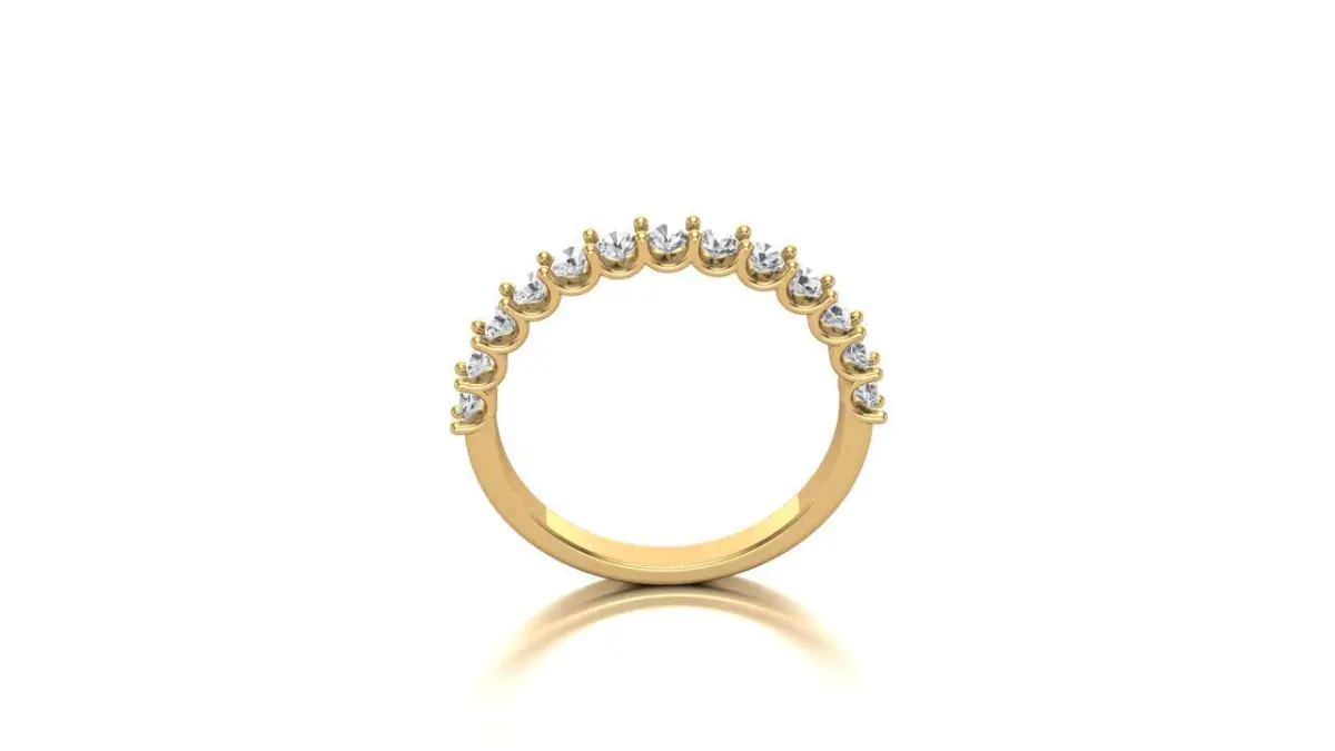 This ring embodies understated elegance and timeless sophistication, showcasing a delicate half eternity band adorned with a row of meticulously set diamonds. The design, characterized by its simplicity and grace, makes it a versatile piece suitable for both everyday wear and special occasions.