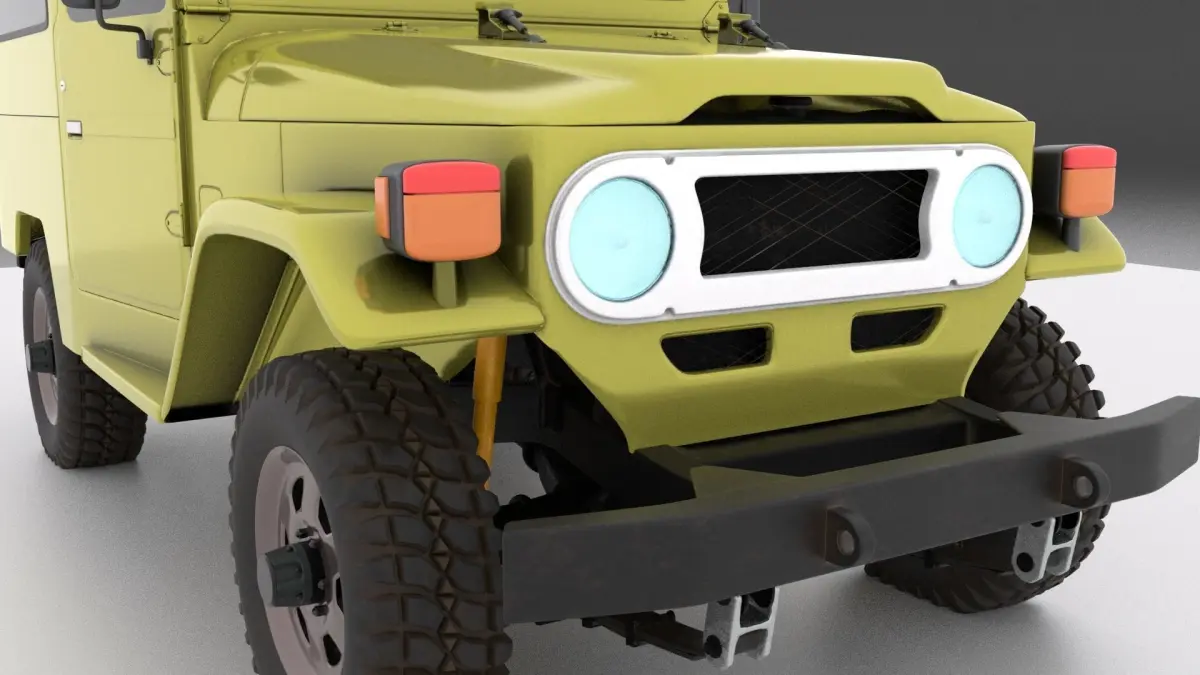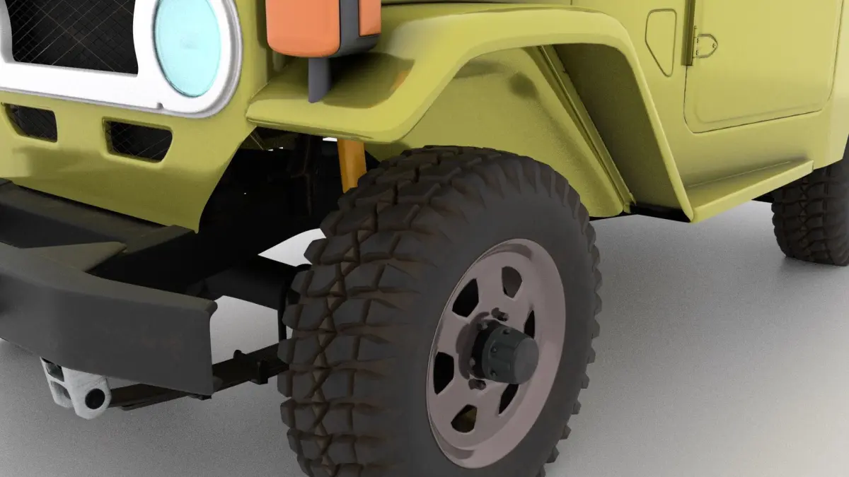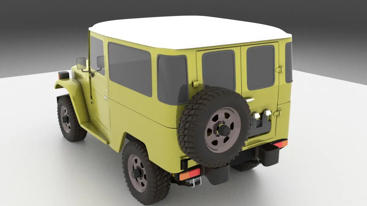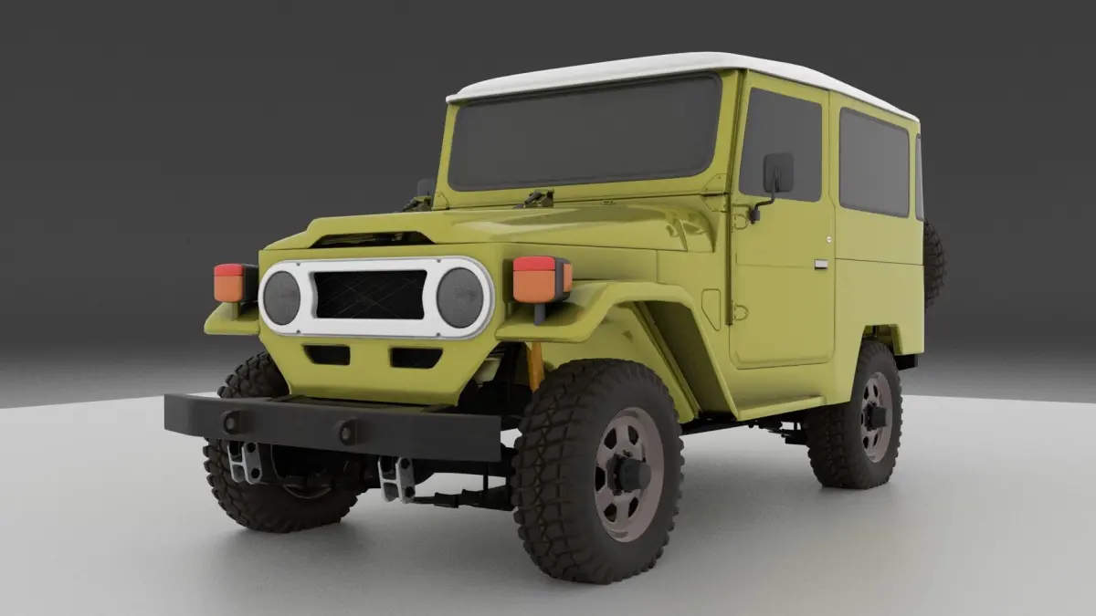 This is a toyota fj40 3d car model modelled in blender v2.79the modell is detailed rendered with cyclesmade of quadessubdividable pbr textures metal roughness workflowAO _ metalic _ roughness _ hight _ normal _ baseColorcarbody 4096x4096 png texturemetal_frame 4096x4096 png texturewheel 2048x2048 png texturethere is render ready .blend file all parts can be separated