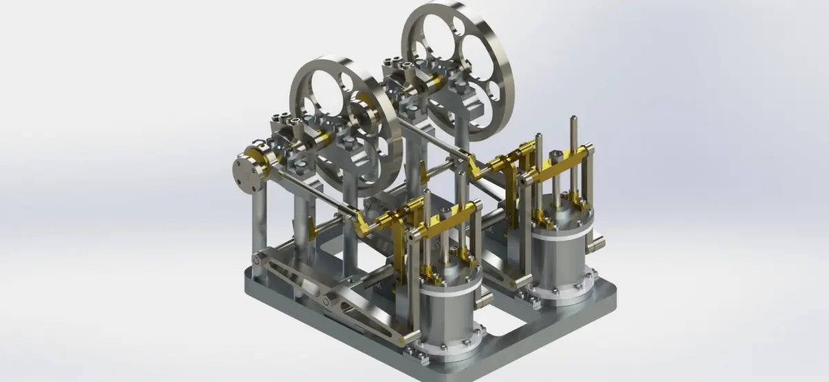 Cylinders: There are two cylinders arranged side by side or in a cross-like pattern.Pistons: Each cylinder contains a piston that moves back and forth within it.Crankshaft: The pistons are connected to a common crankshaft, which converts the reciprocating motion of the pistons into rotational motion.Connecting Rods: Connecting rods link the pistons to the crankshaft, transferring the motion of the pistons to the crankshaft.Side Beam Mechanism: A beam is attached to the connecting rods on both ends and connected to the crankshaft at the center. It transforms the vertical motion of the pistons into the rotational motion of the crankshaft.Working:
