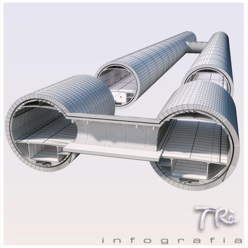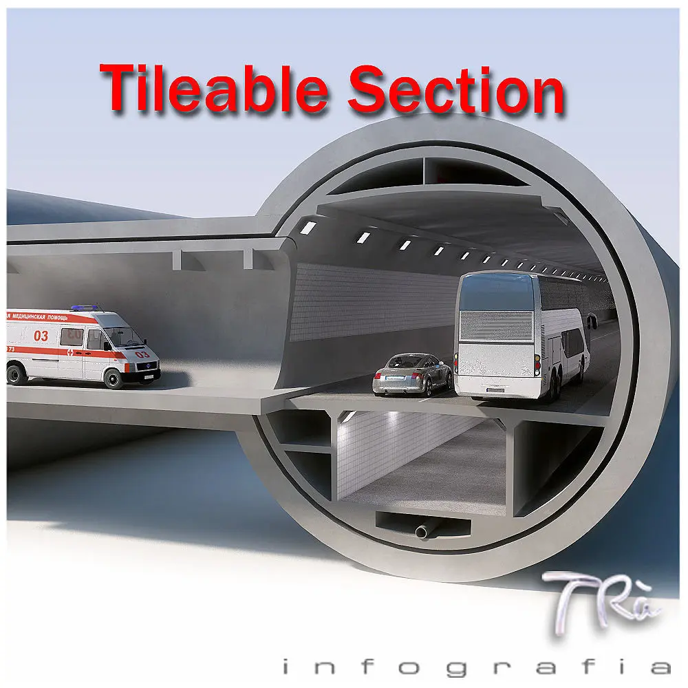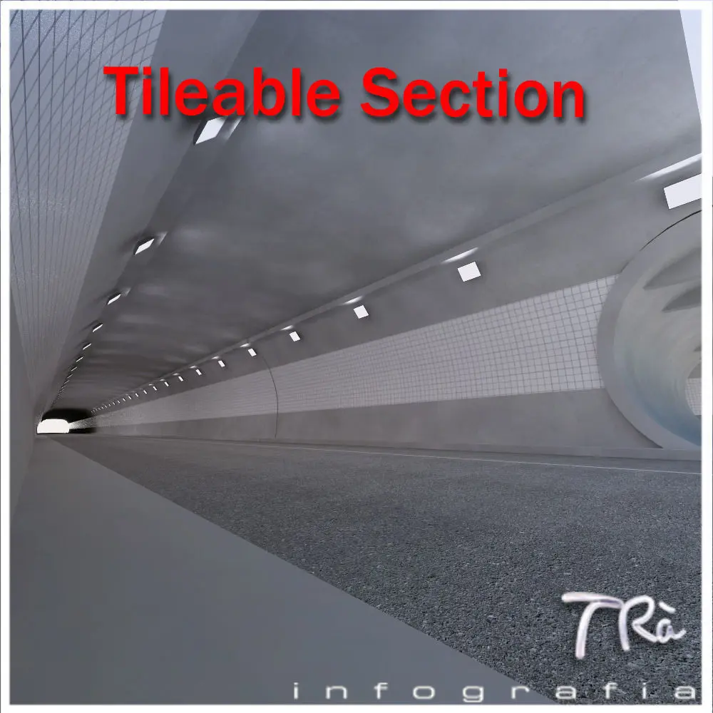 Tunnel section with emergency connections, tileable along a path deform with a displacement of the same for the length of the section, so you can build tunnels infinite and desired shape, include section detail of emergency connection.Modeled with Max 2010 and Vray materials. Includes materials and maps. Vehicles not includes.