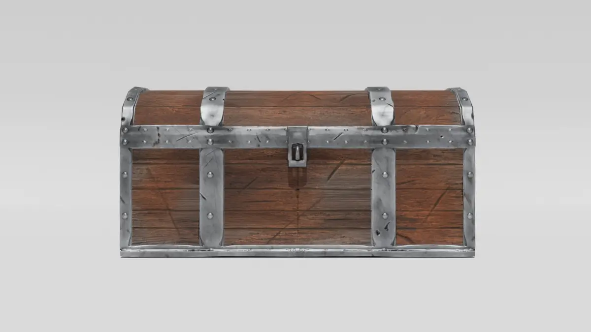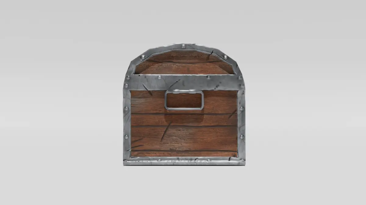 The chest is made primarily of dark brown wood with a natural grain texture. The wood is enhanced with visible lines and marks, adding a rugged and aged aesthetic.Silver or metallic straps surround the chest, providing structural support and a robust appearance. These straps are riveted with round metal studs for additional reinforcement and a decorative touch.