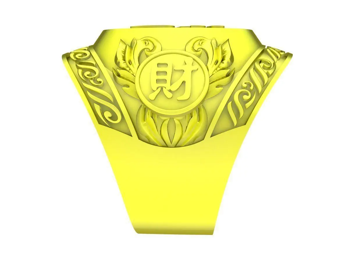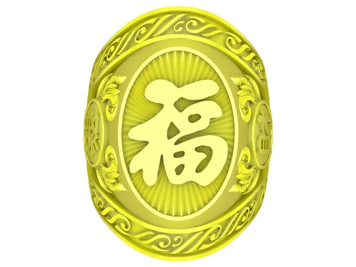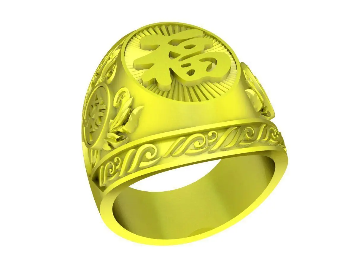 High quality 3D model of 24K happy Chinese letter men ring featuring traditional Chinese character design symbolizing happiness and good fortune perfect for jewelry cad design 3D printing rendering and professional jewelry manufacturing suitable for cultural jewelry collections feng shui men rings and custom 24K gold inspired jewelry.