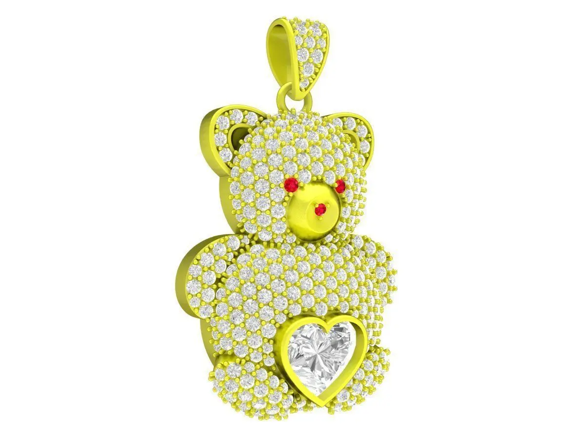 This luxury pendant design features a charming teddy bear silhouette fully covered with pavé-set round gemstones, creating a playful yet high-end jewelry statement. The bear form is carefully sculpted with smooth contours and balanced proportions, while the heart-shaped accent at the center adds a romantic and emotional touch to the overall design.