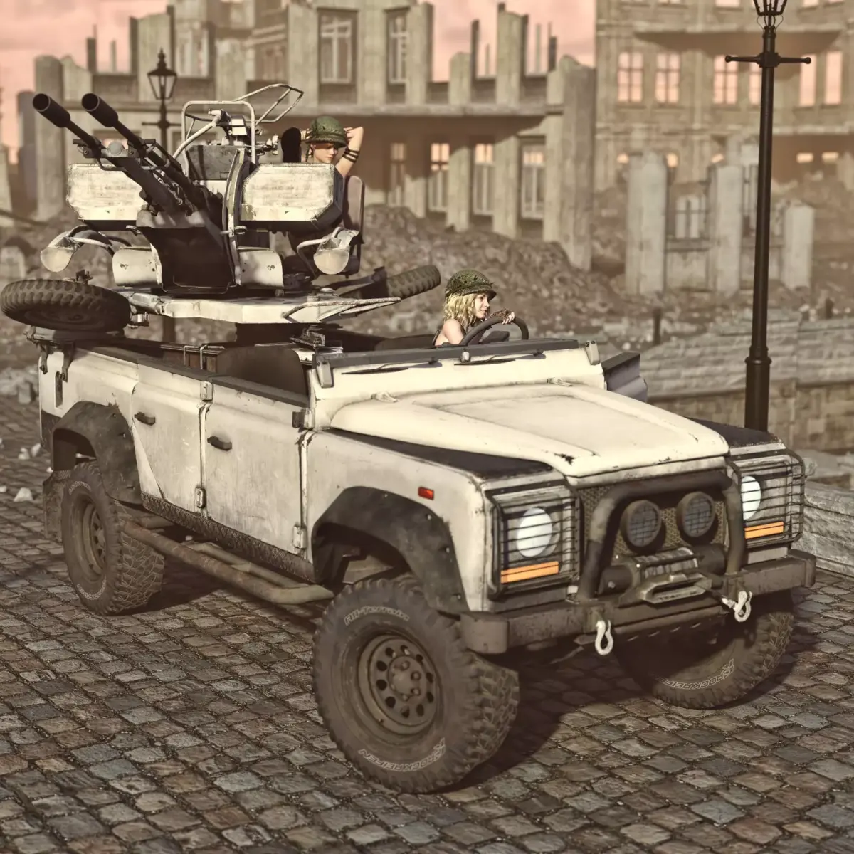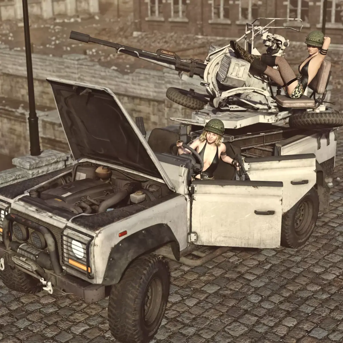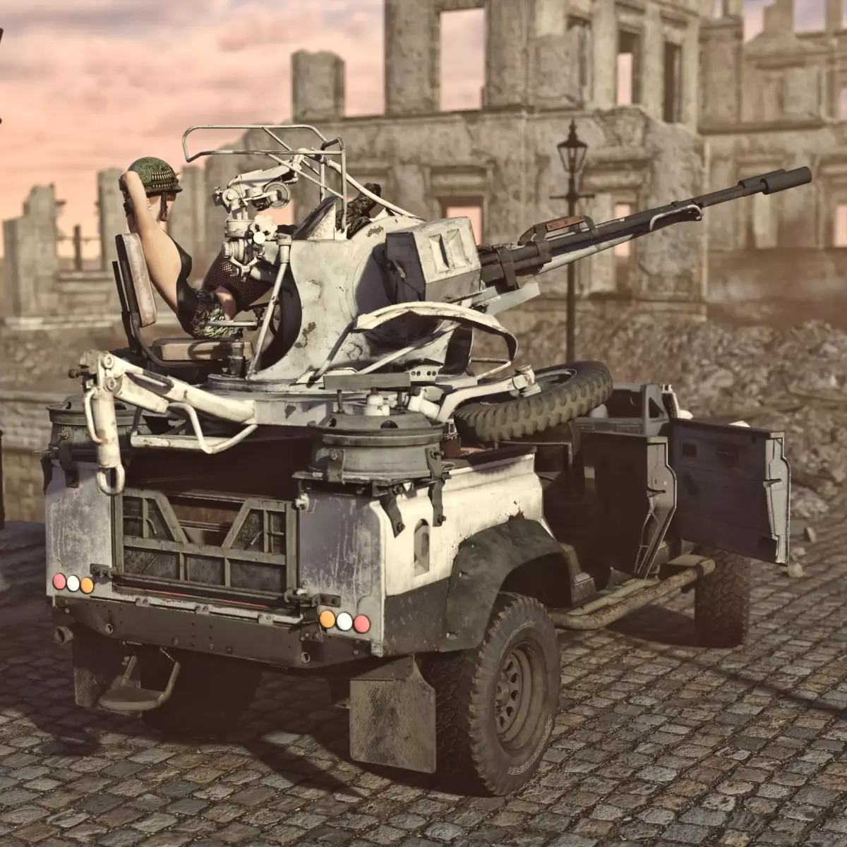 Vehicle with anti- aircraft gun. Not a small gun. The gun is rigged, can rotate and pivot. Good for transportation, combat and fast retreat. You can also take your friends with you- it has some space. Doors can also be opened and closed as you wish. So is engine hood. Converted and rigged for DAZ.