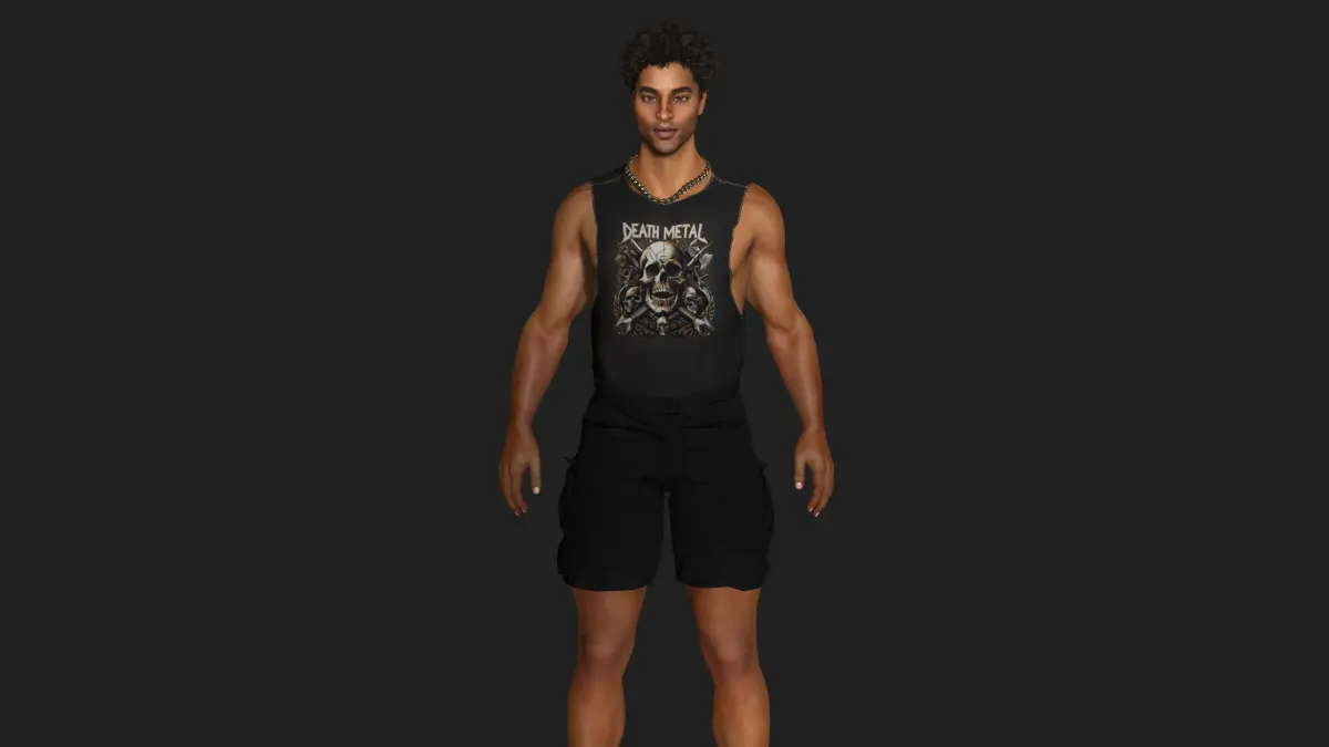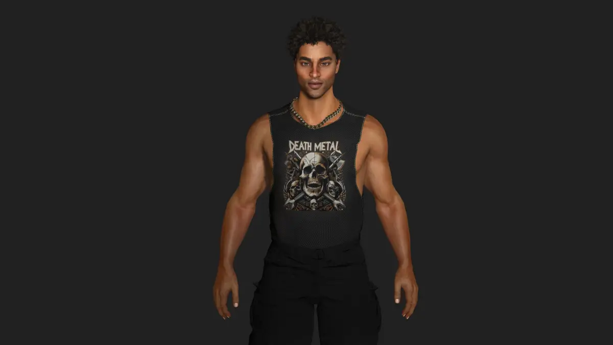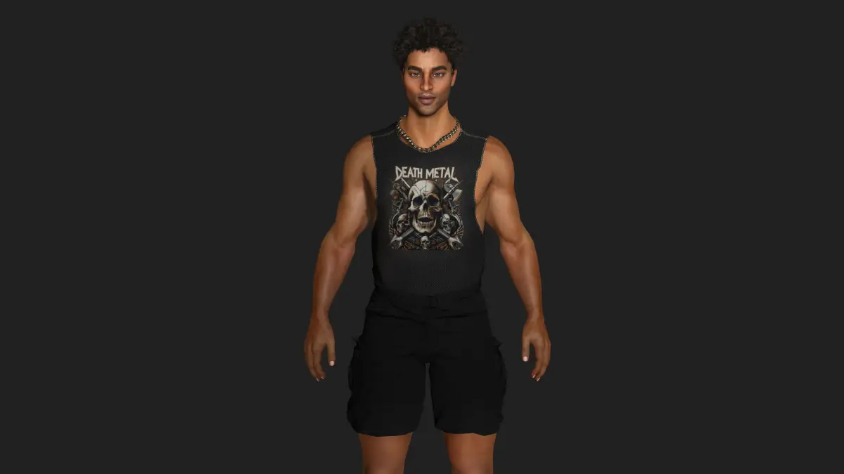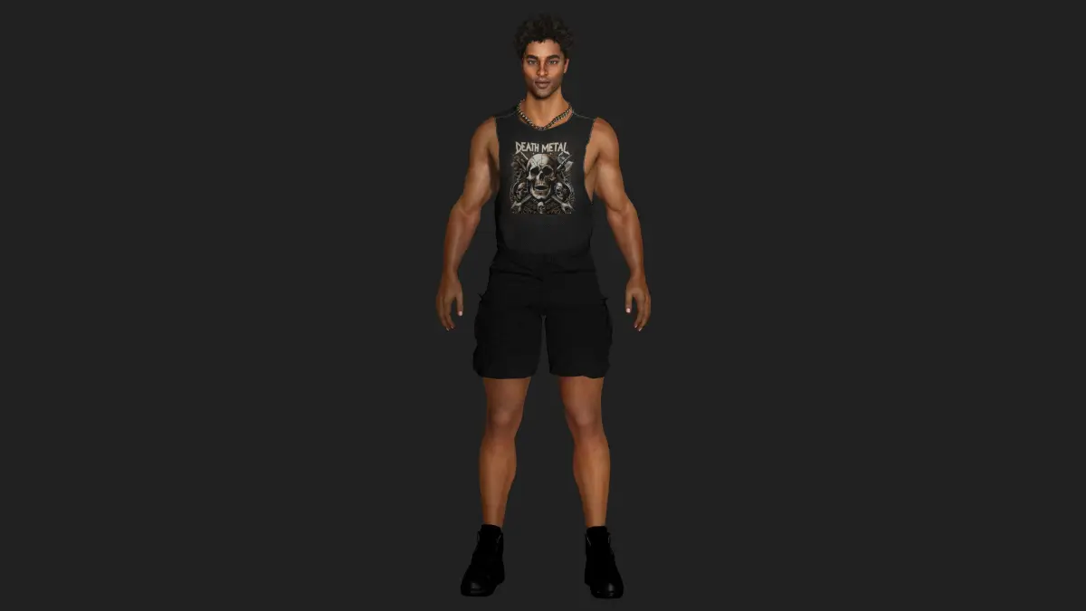 Muscular African Man, Street Style / Fungky / GTA, Manly Face, Dark Afro hair, Dark Skin, Brown eyes, Muscular Body Type , Pants, T-Shirt, Necklace, Shoes