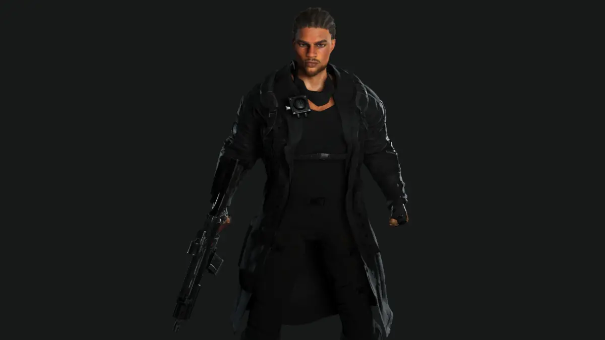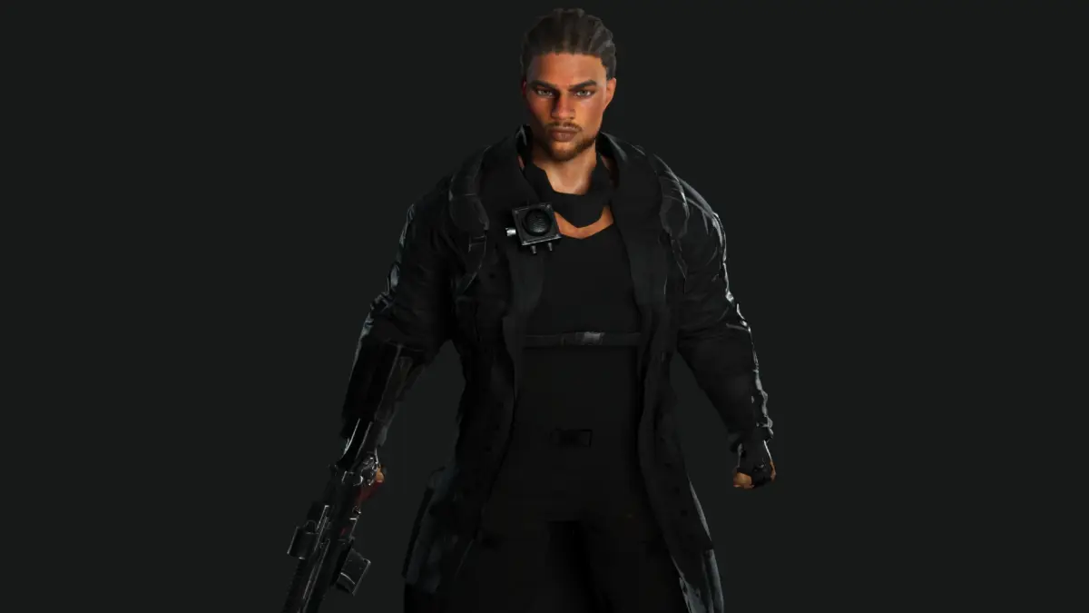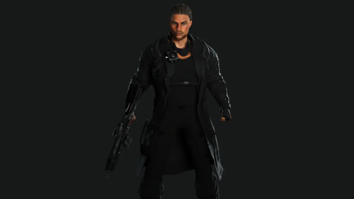 Muscular Black Man, Gun Shooter / Military / Sniper Outfit , Manly Face, Braided hair, black Skin, Green Greyish eyes, Dark hair, Muscular Body Type, Beard, Moustache , Coat, Tshirt, Shoes, Gloves, Bag, Scarf, Radio Pocket, Pants
