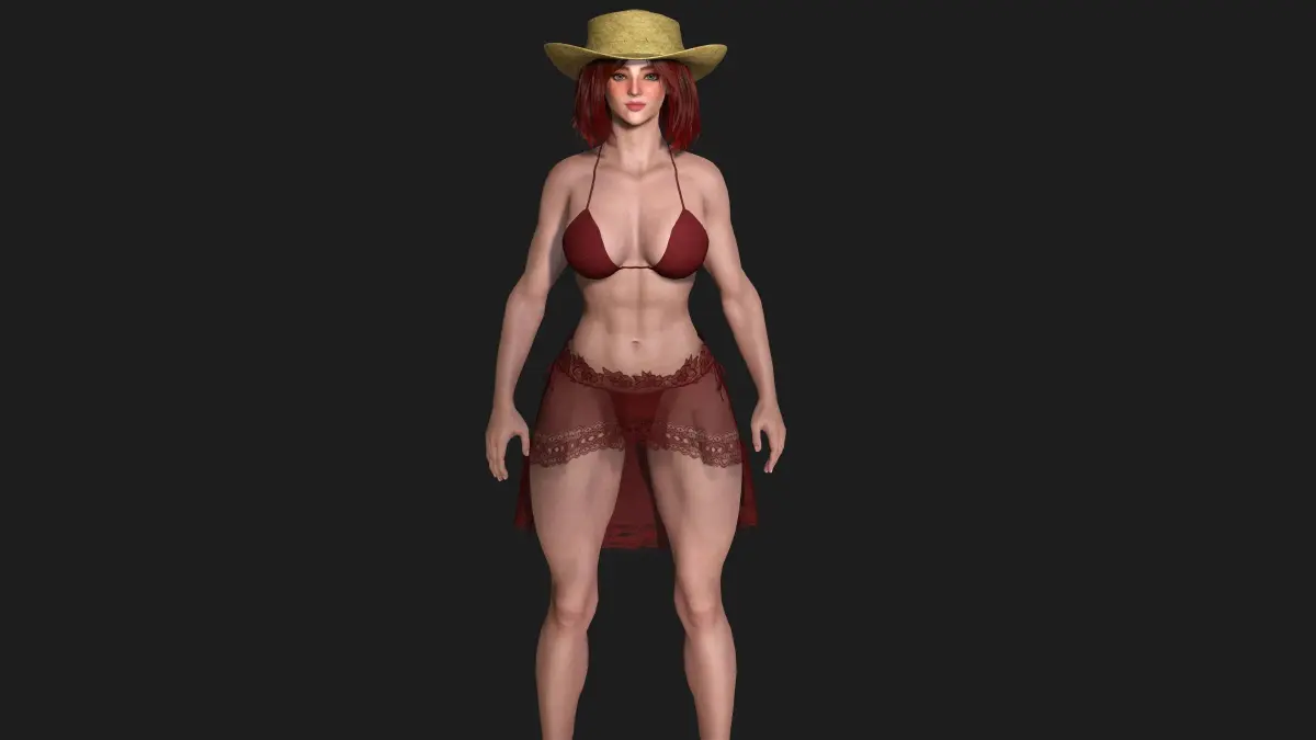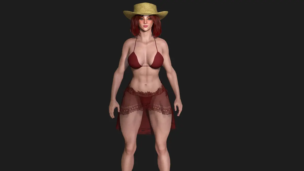 Beautiful Female Character, Muscular Girl . Oriental face, Straight hair, Red hair, Light Skin, Dark Grey Eyes, Muscular Body Type