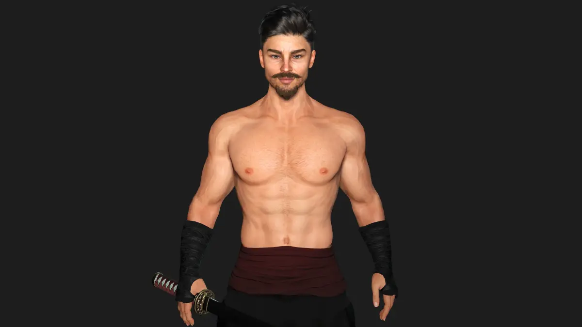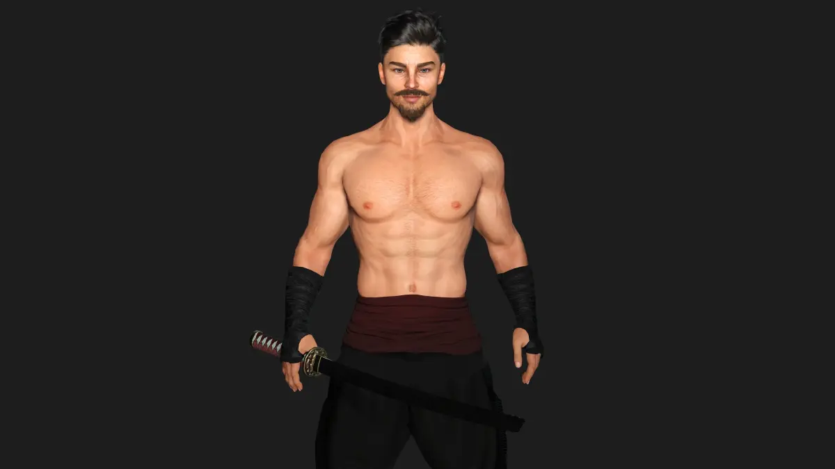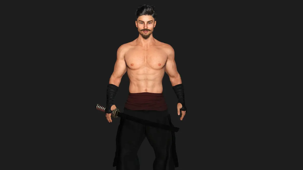 Muscular Man wearing Kungfu Outfit , Manly Face, Dark hair, Light Skin, Grey eyes, Muscular Body Type , belt ,Pants, Shoes, Arm wrapper, Weapon, Katana