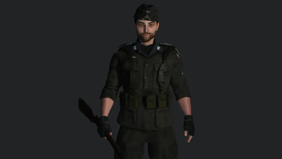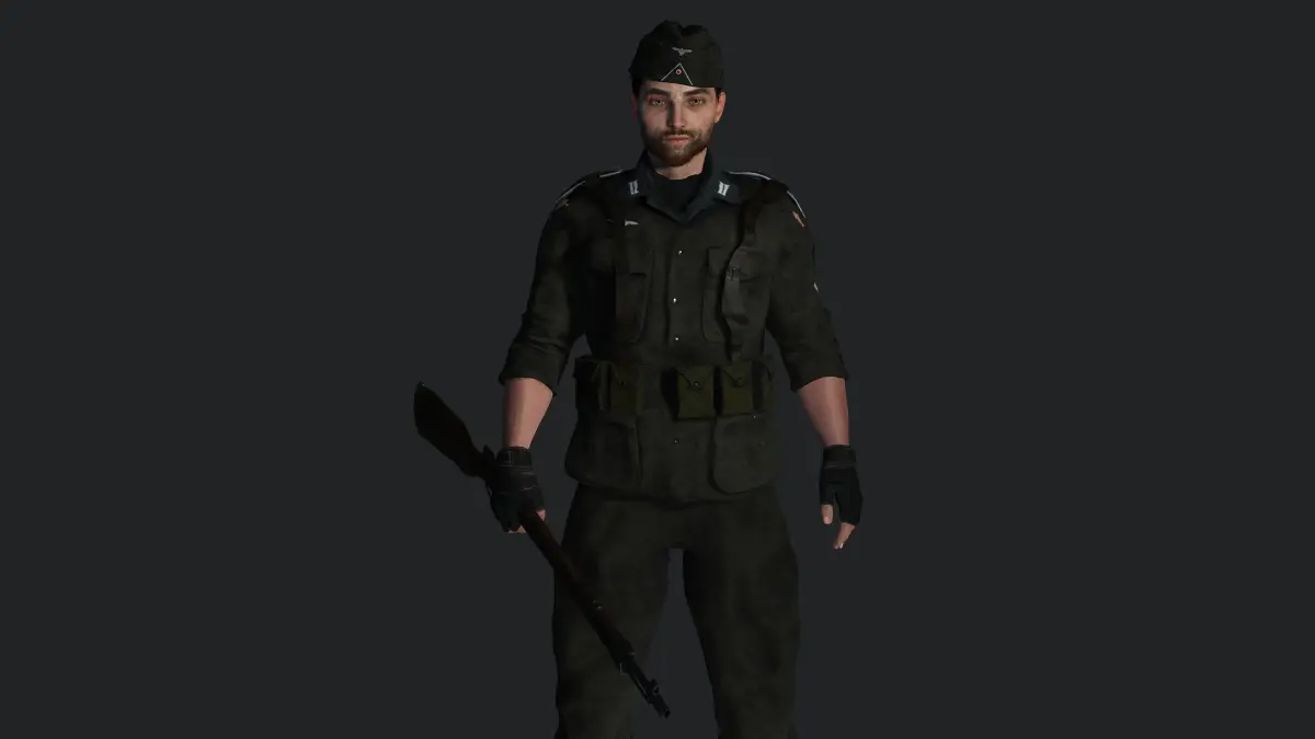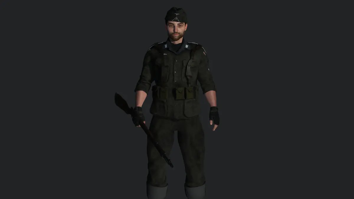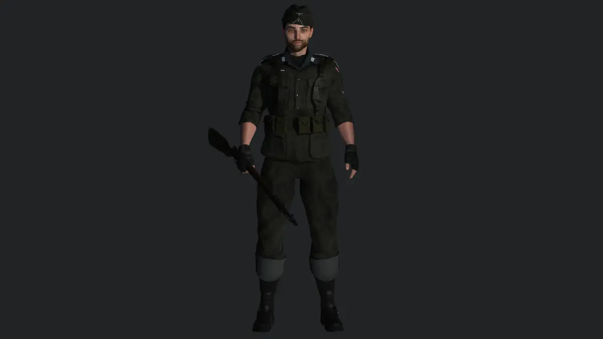 Muscular Man, Army / Military / Sniper / Shooter , Manly Face, Straight hair, white Skin, Green Greyish eyes, Dark hair, Muscular Body Type, Beard, Moustache , Top, Pants, Shoes, Gloves, Cap, Pocket, Bag, Riffle