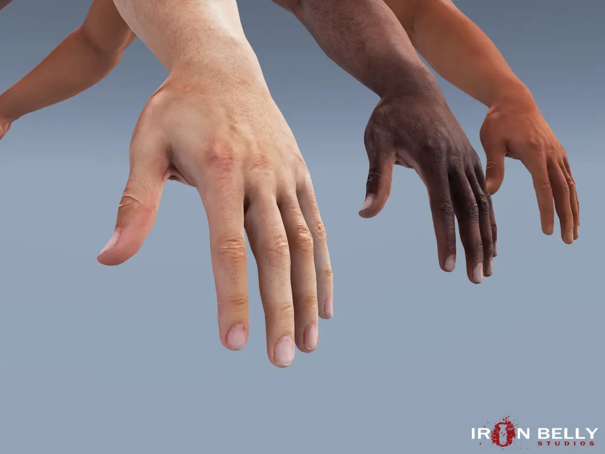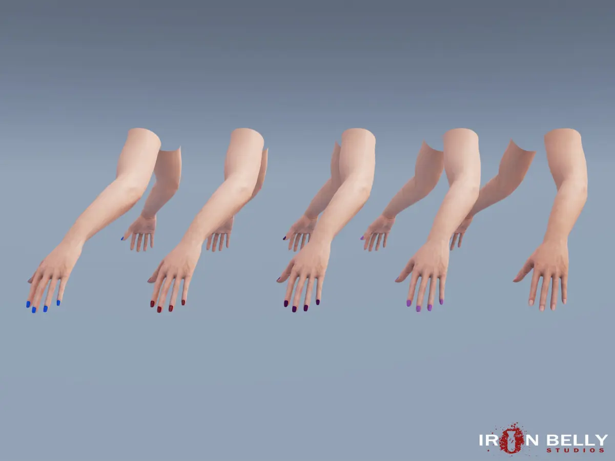 The Ironbelly Studio “AAA Quality First Person Arms” 4-pack comes with fully rigged and animated sets of arms. Each arm pair has three included skin tones (Light, Medium, and Dark), and each female pair has five nail polish options. Additionally, we have included military fatigues and fingerless gloves with two camo textures, which are compatible with both male and female arm models. The First Person Arm Pack is perfect for customization into any first or third person product!