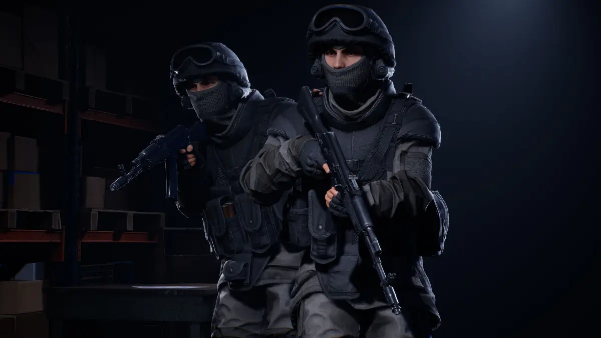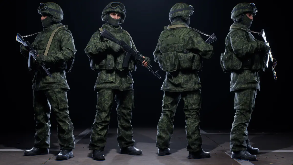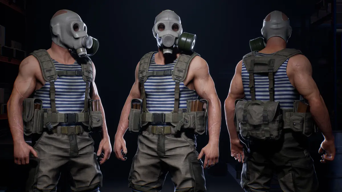 The character is divided into 7 sets: Body [Head, torso, arms, hands, arms, feet], pants with boots, jacket, gloves, unloading, pouches, equipment and a head gear.