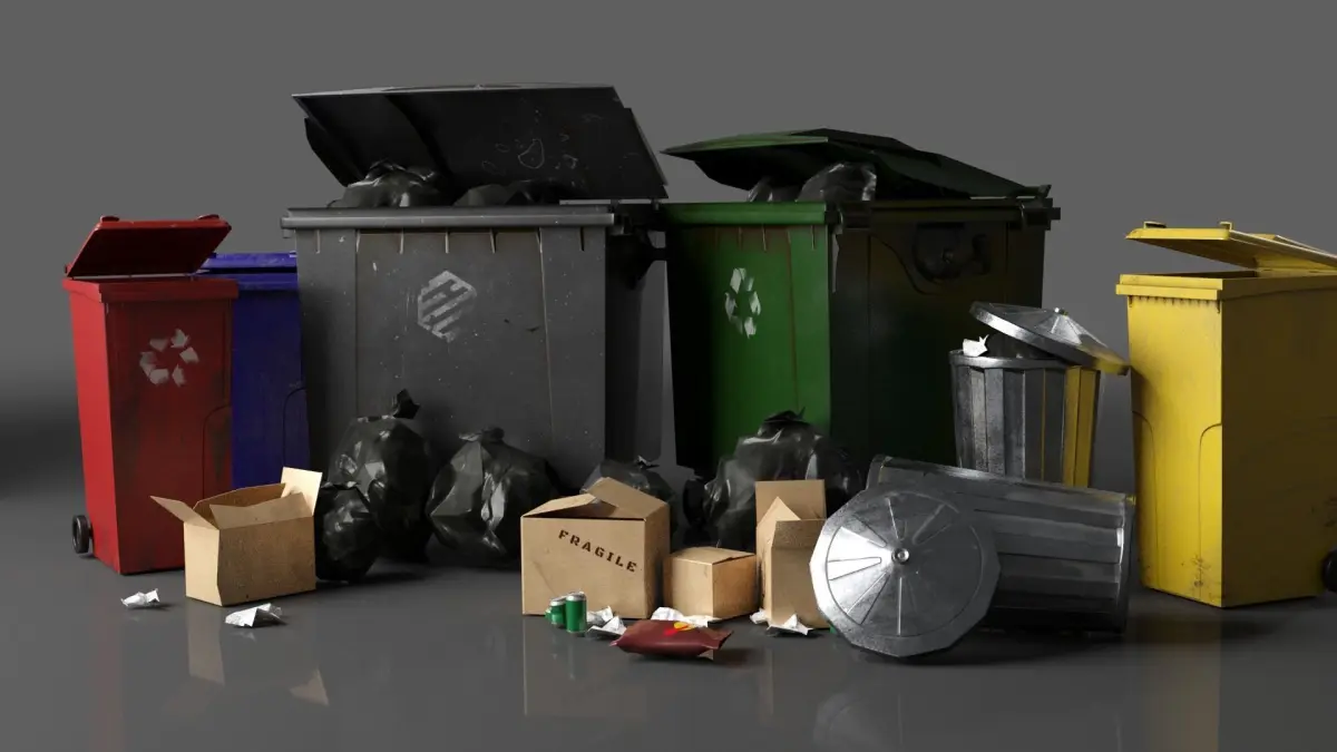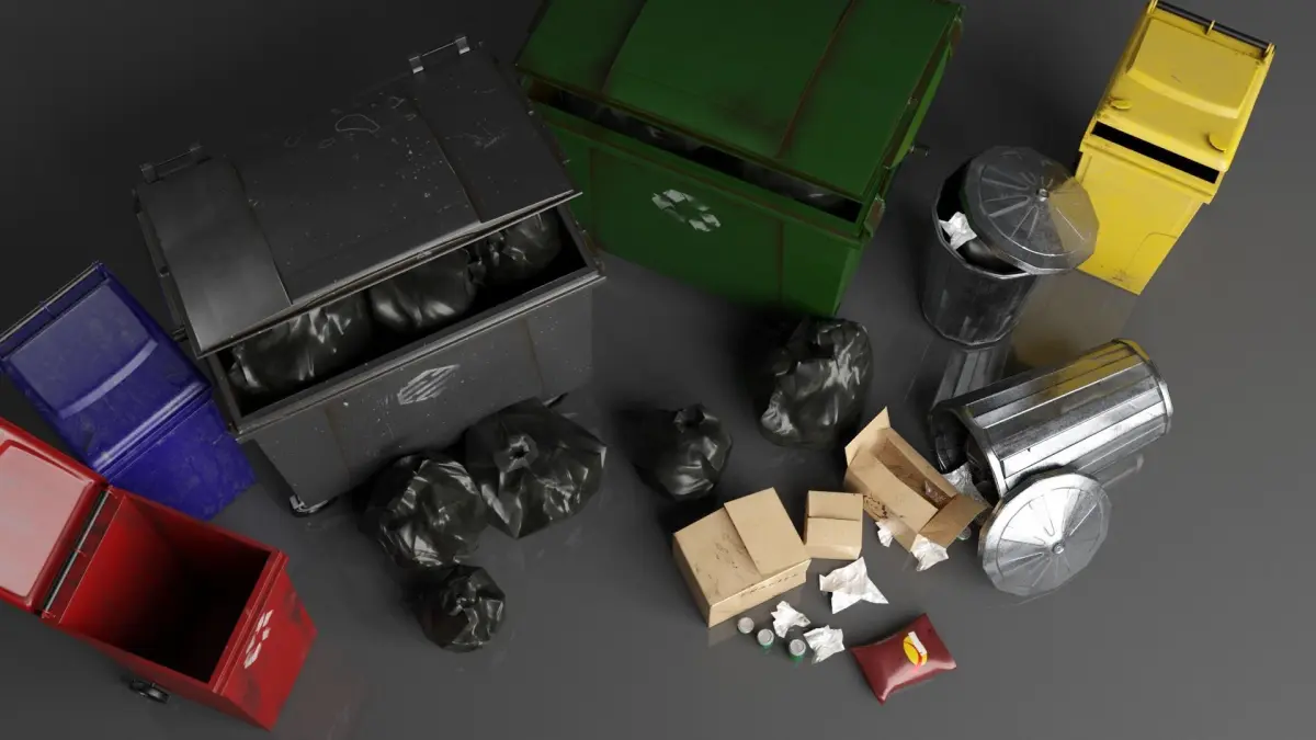 This pack includes: • 2 Dumpsters: 2048x2048 texture with 2 different colors and 2 levels of dirt • 3 Trash Bins: 2048x2048 texture with 3 different colors and 2 levels of dirt • Trash Cans: 2048x2048 texture with 2 levels of dirt • Trash (3 carboard boxes, 3 types of paper, 3 soda cans): 2048x2048 texture • 5 Garbage bags: 2048x2048 texture