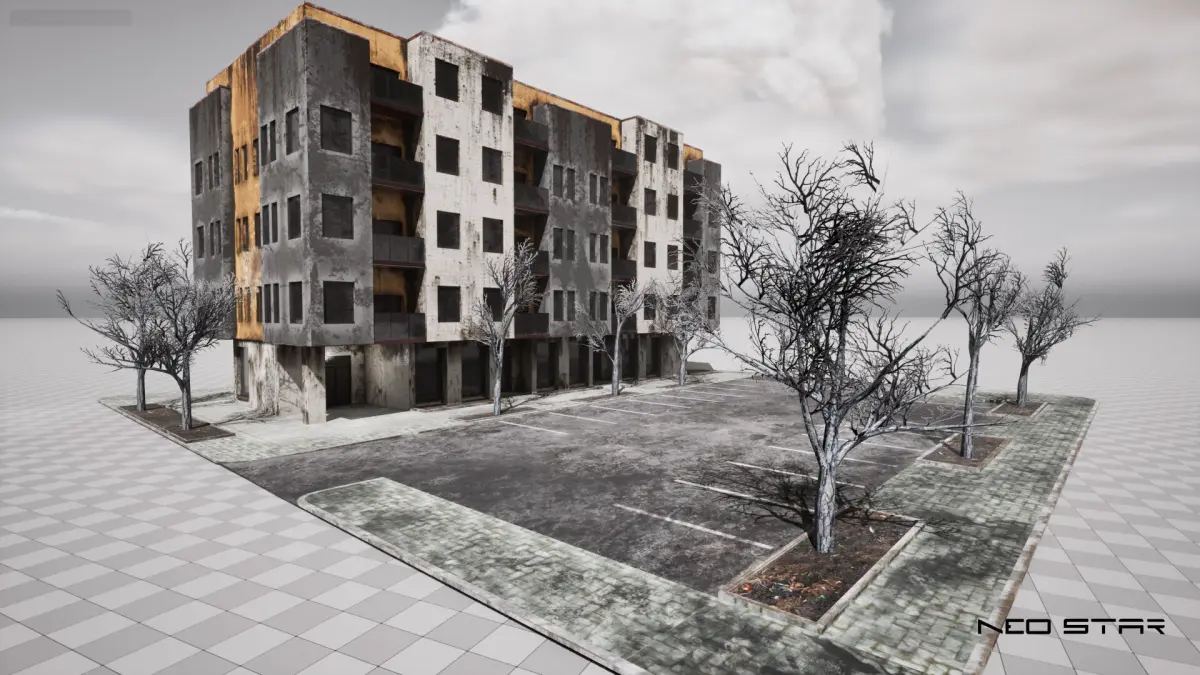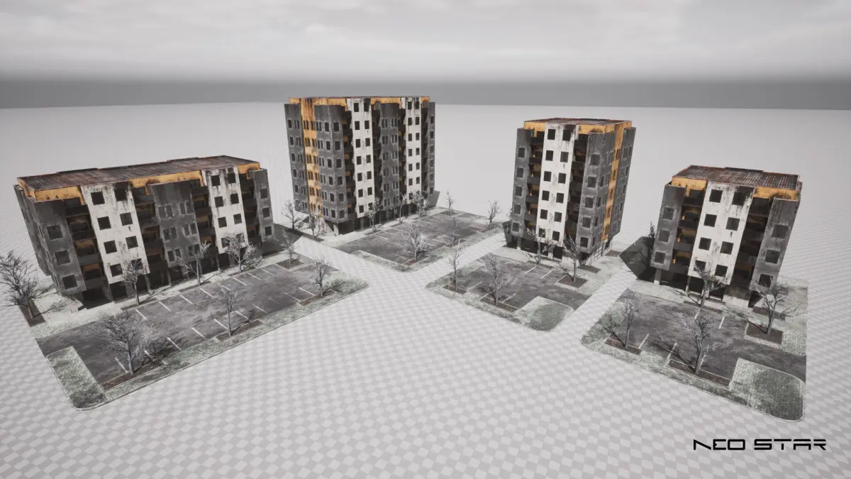 Low-poly abandoned up-market apartment blocks designed for use in games, ideal for post-apocalyptic environments. The buildings are exterior only and contain only a single material to ensure optimal performance and to be easy to import into any game engine.
