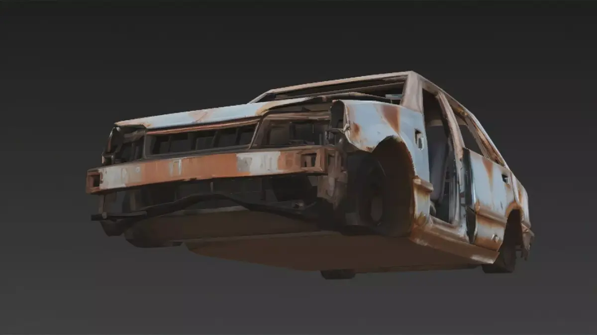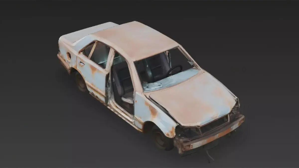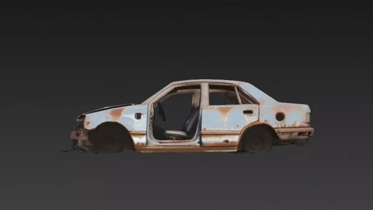 This 3D model features a damaged and worn-out sedan, showcasing rusted metal surfaces, broken structures, and aged details that reflect long-term environmental exposure. The design captures the look of a discarded vehicle left in decay, with deformed panels, missing parts, and weathered textures.