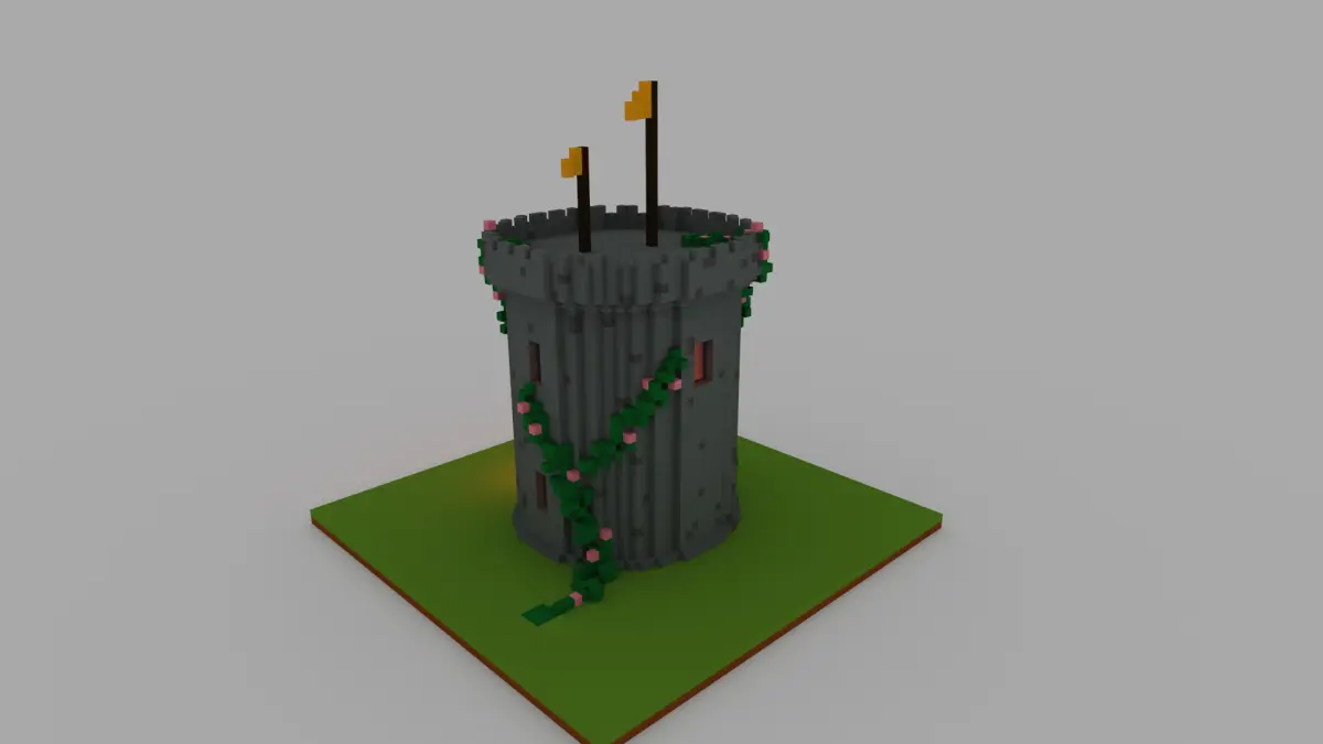 Immerse yourself in a medieval atmosphere with this detailed voxel-style watchtower. Designed in MagicaVoxel, this model features a beautifully crafted stone tower wrapped in lush vines and blooming flowers. The warm glow at the entrance adds a touch of realism, making it a perfect addition to any fantasy setting.