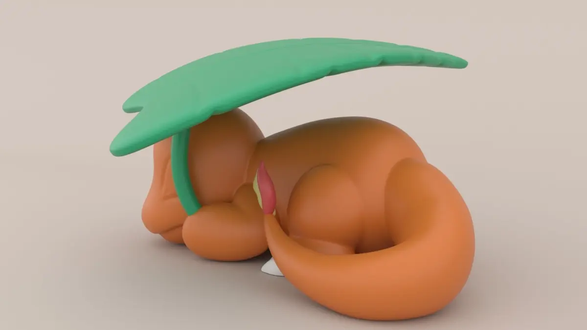 A model of Charmander, abandoned, holding a leaf and curled up based on the one in the episode Charmander – The Stray Pokemon.