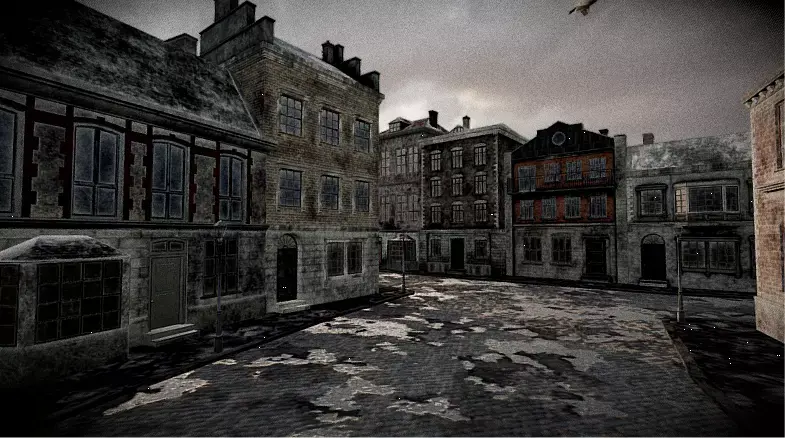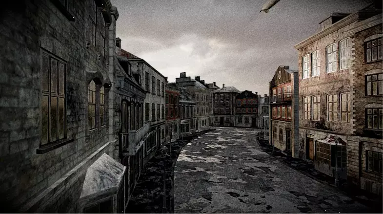 This 3D model environment depicts an abandoned city street, crafted with realistic architectural detailing and atmospheric depth. The scene features weathered brick and stone buildings, cracked pavement, scattered leaves, and overgrown vegetation, evoking the mood of a forgotten urban landscape. The muted color palette, broken textures, and environmental storytelling suggest a post-apocalyptic, war-torn, or neglected setting, ideal for immersive visualizations. Subtle elements such as the leaning lamppost, bare trees, and distant airship enhance the cinematic quality, making this model highly versatile for different creative genres.