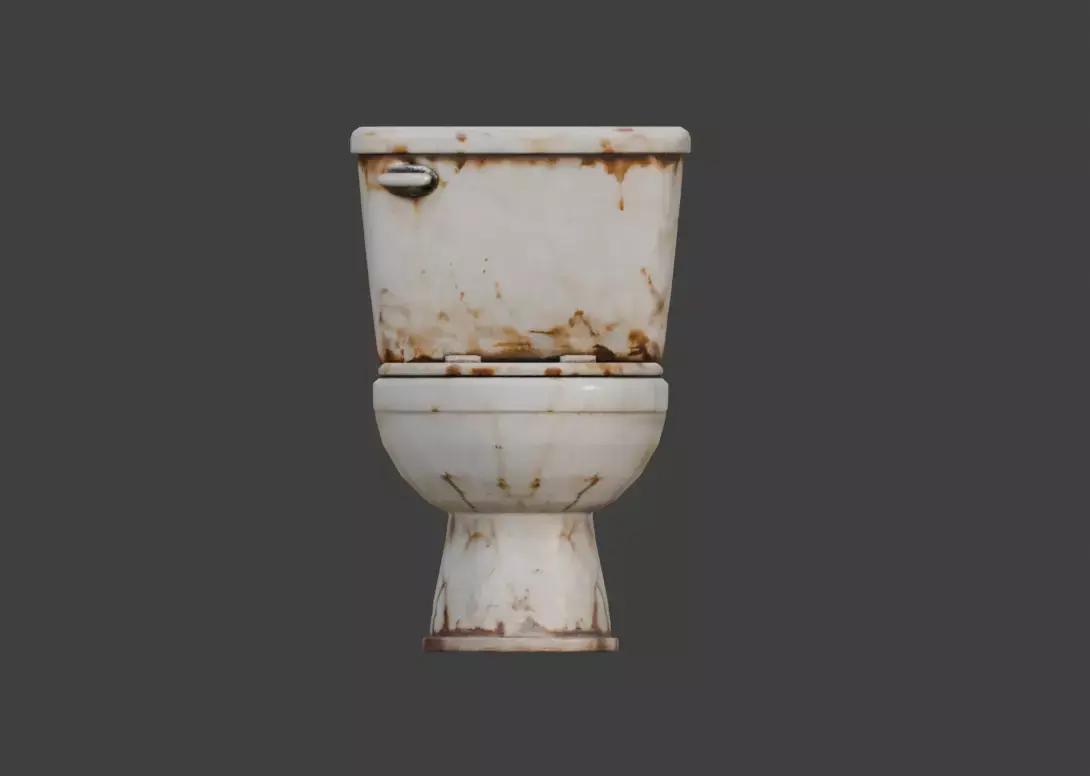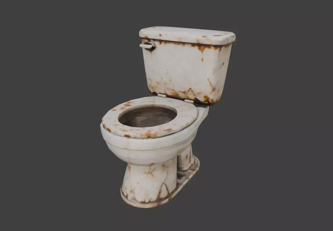 The toilet’s structure follows a recognizable, classic design: a tank-mounted flush system, rounded bowl, and thick ceramic base. However, any sense of cleanliness has long since vanished. The porcelain is discolored with deep brown stains, mineral buildup, and streaks caused by years of moisture exposure. Rust creeps along metal fittings and seams, while dirt accumulates in crevices, emphasizing how long the fixture has been unused or improperly maintained. The bowl interior appears darkened and corroded, reinforcing the asset’s unsettling presence.