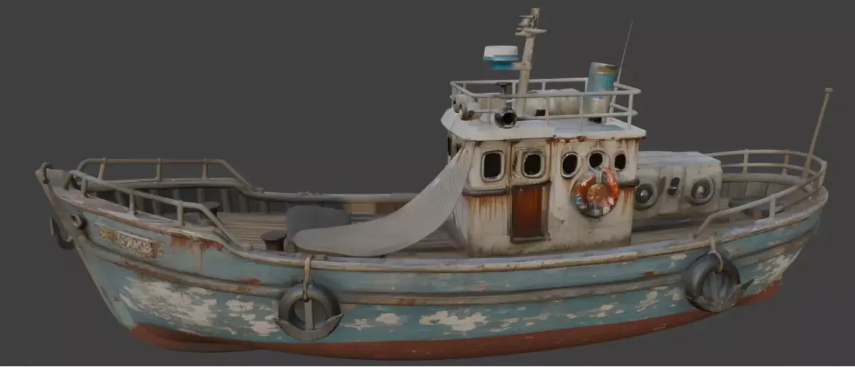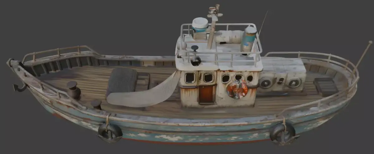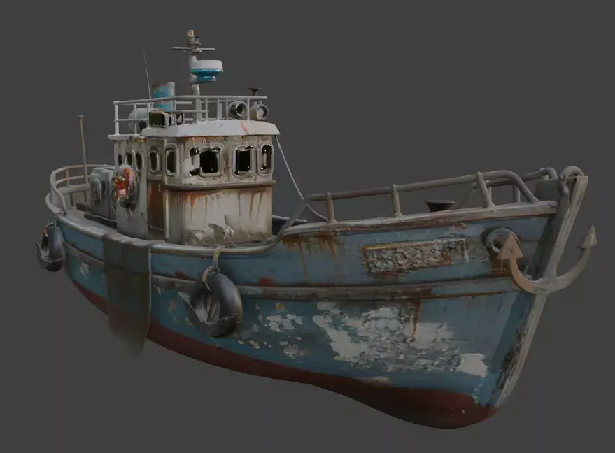 Highly detailed, game-ready 3D model of a weathered mid-20th-century fishing trawler showing years of neglect: chipped paint, heavy rust streaks, broken windows, torn nets, faded markings, and authentic deck clutter. Includes detailed cabin interior, railings, winches, tires, life ring, and antennas. Fully PBR textured, clean quad topology, optimized for real-time rendering, survival games, post-apocalyptic scenes, or cinematic storytelling.