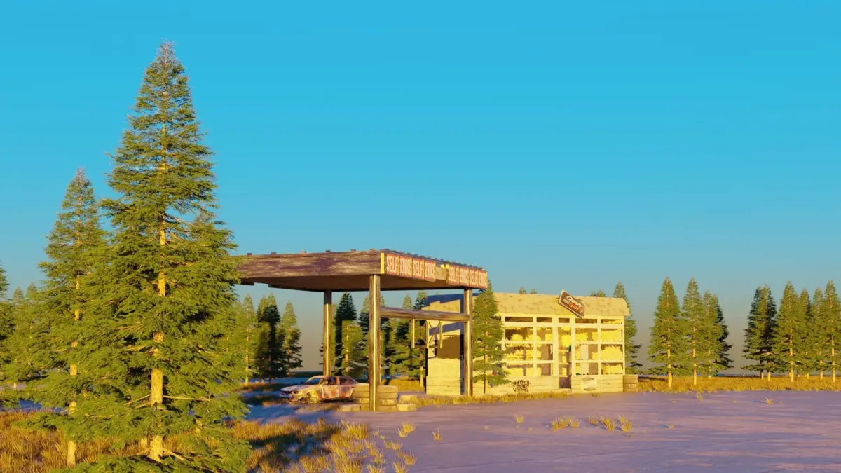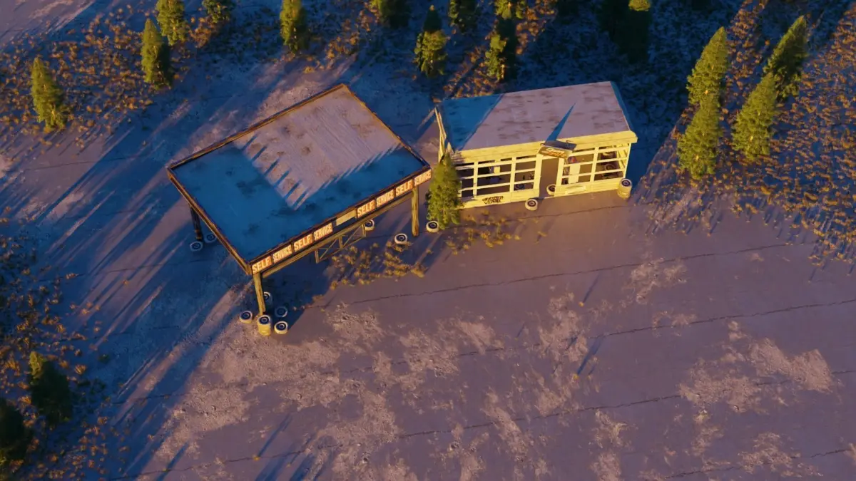 3D scene of an abandoned gas station.