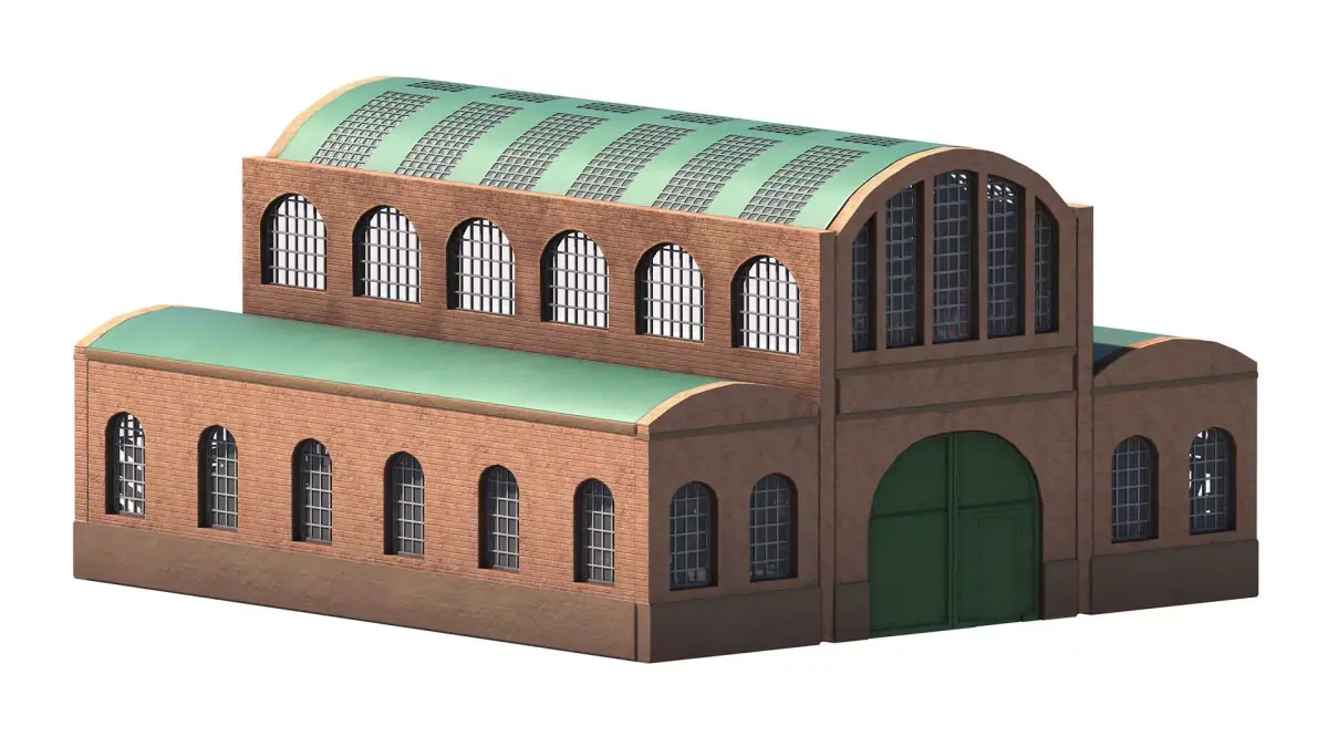 Design: The design includes high arched windows (typical of industrial architecture) for maximum natural light, and a massive single green main door designed for train or locomotive access.