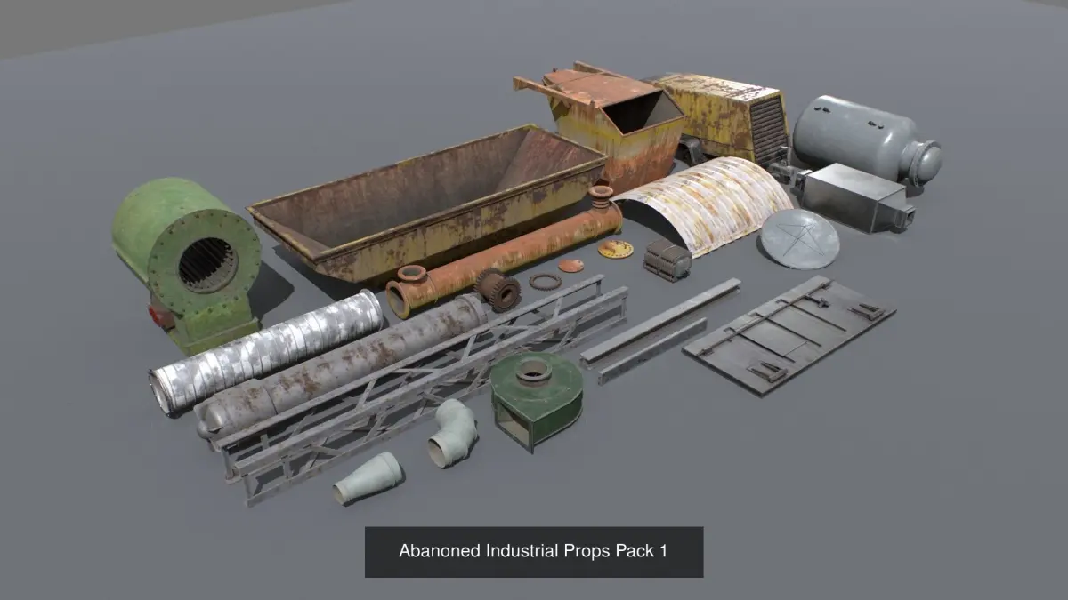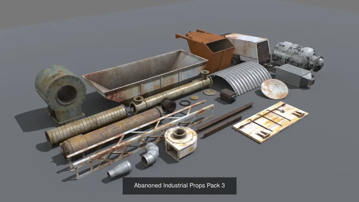 Abandoned industrial props based in real ones. Real scale. Comes with 23 objects and 9 sets of textures each one with 4096x PBR textures including Albedo, Normal, Metalness, Roughness and AO. ARM mask texture included (ao, rough, metal) and also unity HDRP mask (M, A, D, S).