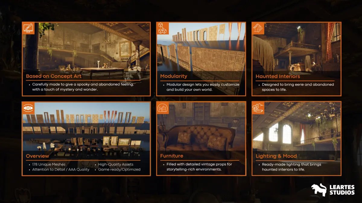 Abandoned Mansion Environment with 178 Unique Meshes. Including all showcased high-quality assets. With a good level of detail and optimized for game-ready projects.