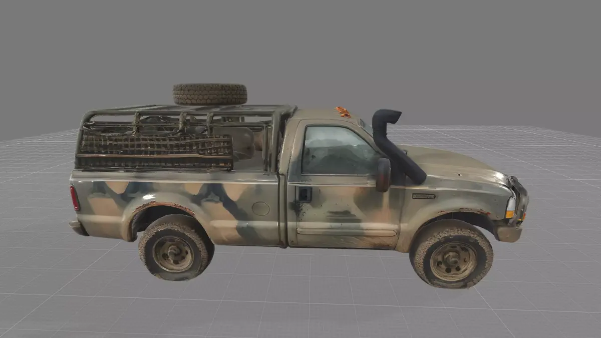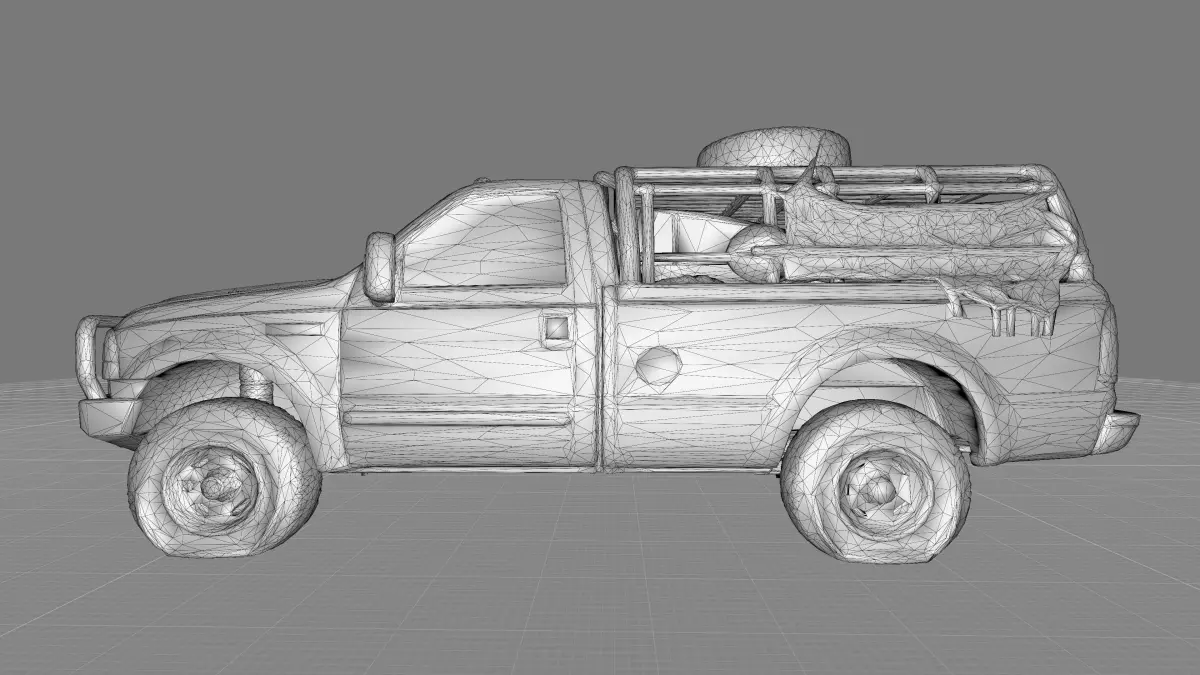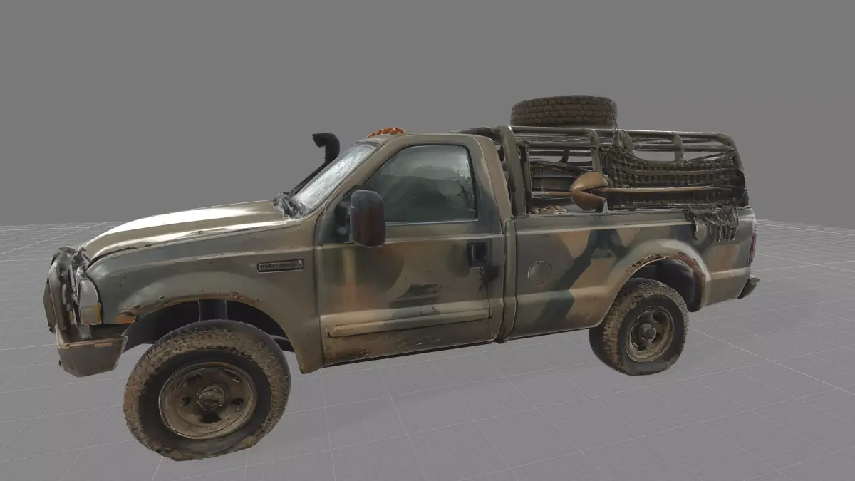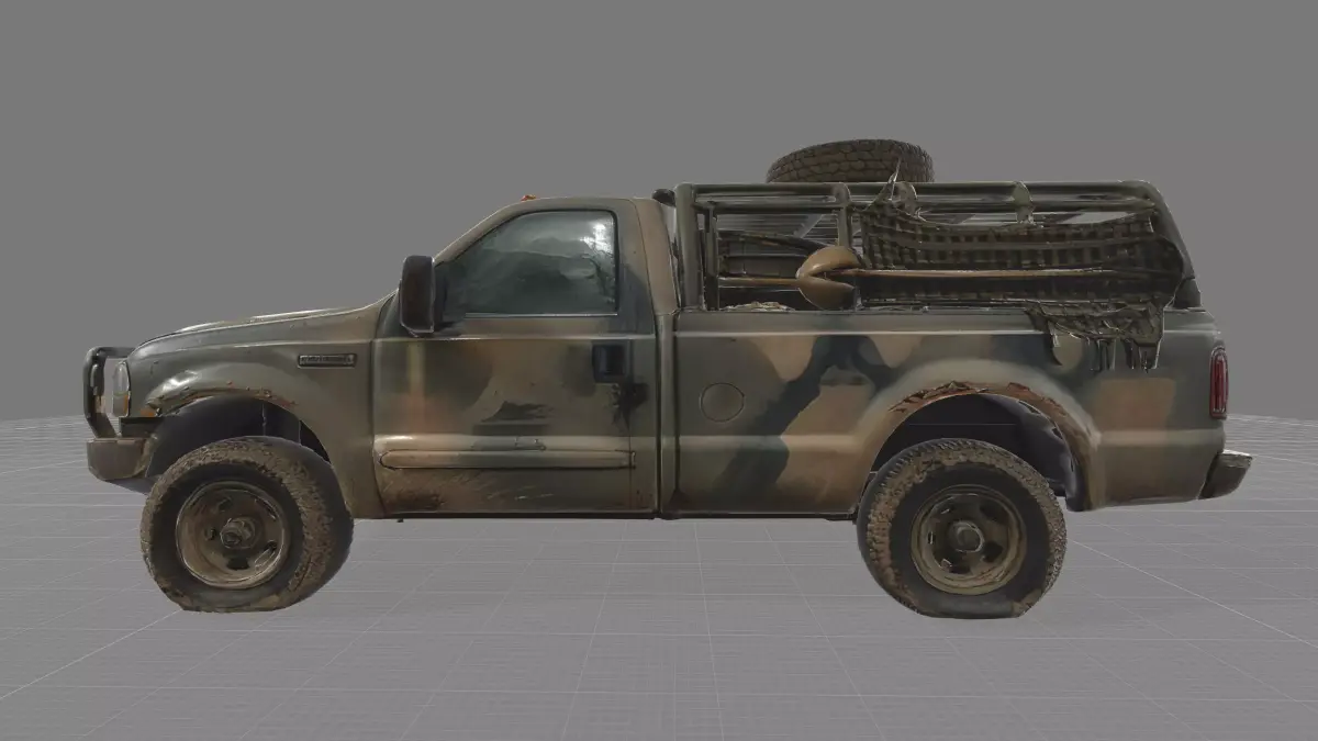 Abandoned Military Utility Pickup high quality game ready 3D model optimized for real time engines and cinematic rendering. This triangulated mesh contains 49758 faces and 40302 vertices, designed for strong silhouette quality while maintaining performance efficiency. The asset includes high resolution 4K PBR textures with realistic surface wear including faded tactical paint, rusted metal, worn rubber and subtle dirt accumulation for believable environmental storytelling.