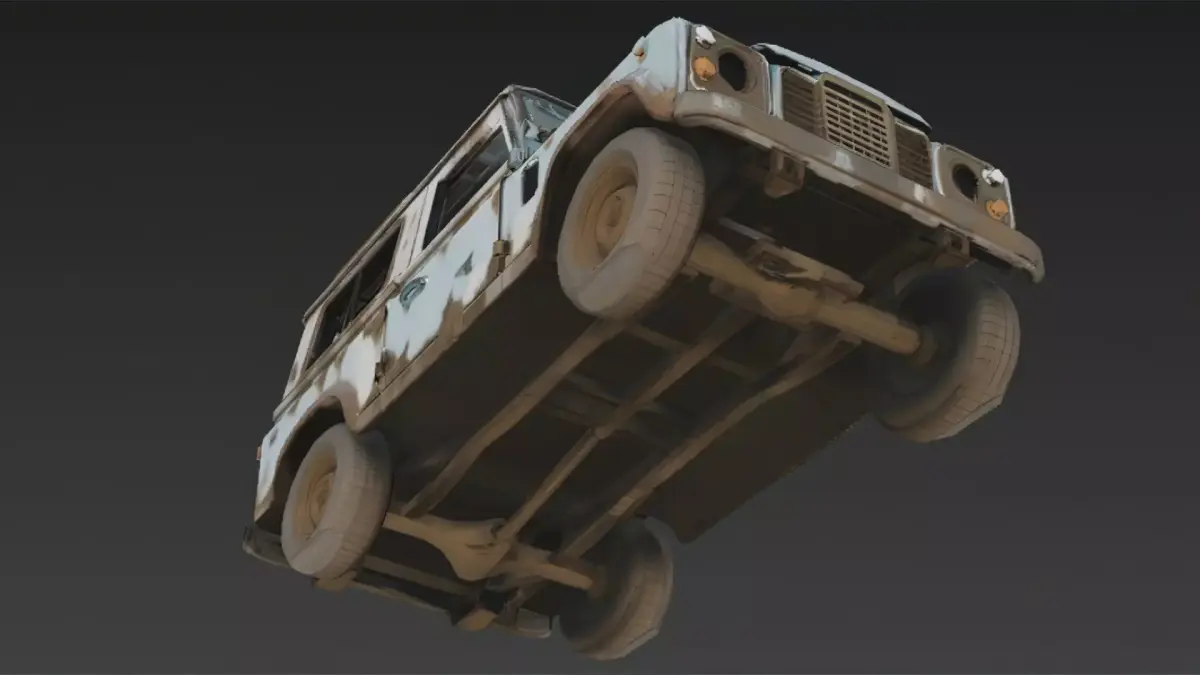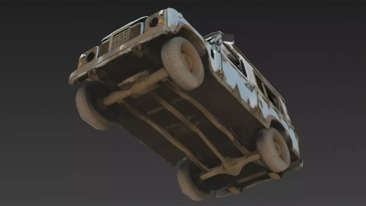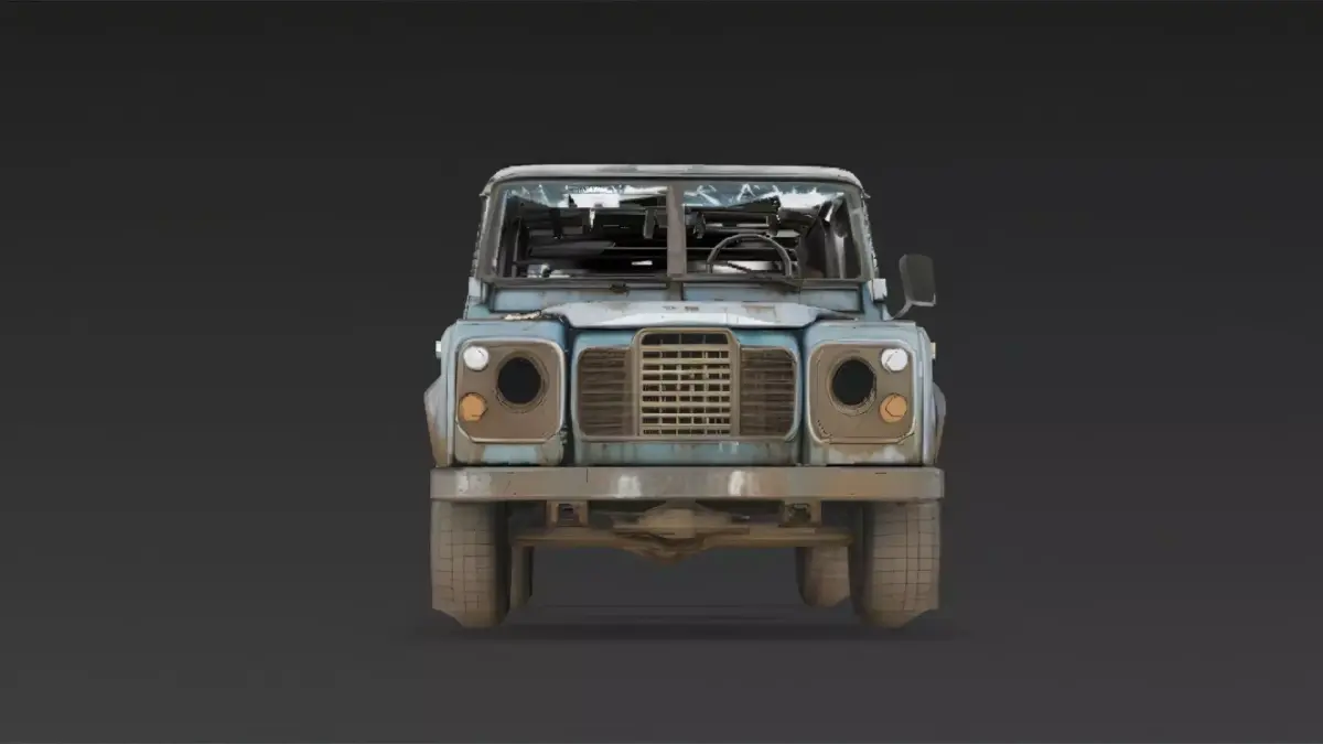 This 3D model features a heavily damaged off-road vehicle, showcasing rugged structural wear, rusted metal surfaces, and broken components caused by long-term exposure to harsh environments. The design highlights reinforced frames, worn tires, and deformed body panels, capturing the look of a once-durable vehicle left to decay.