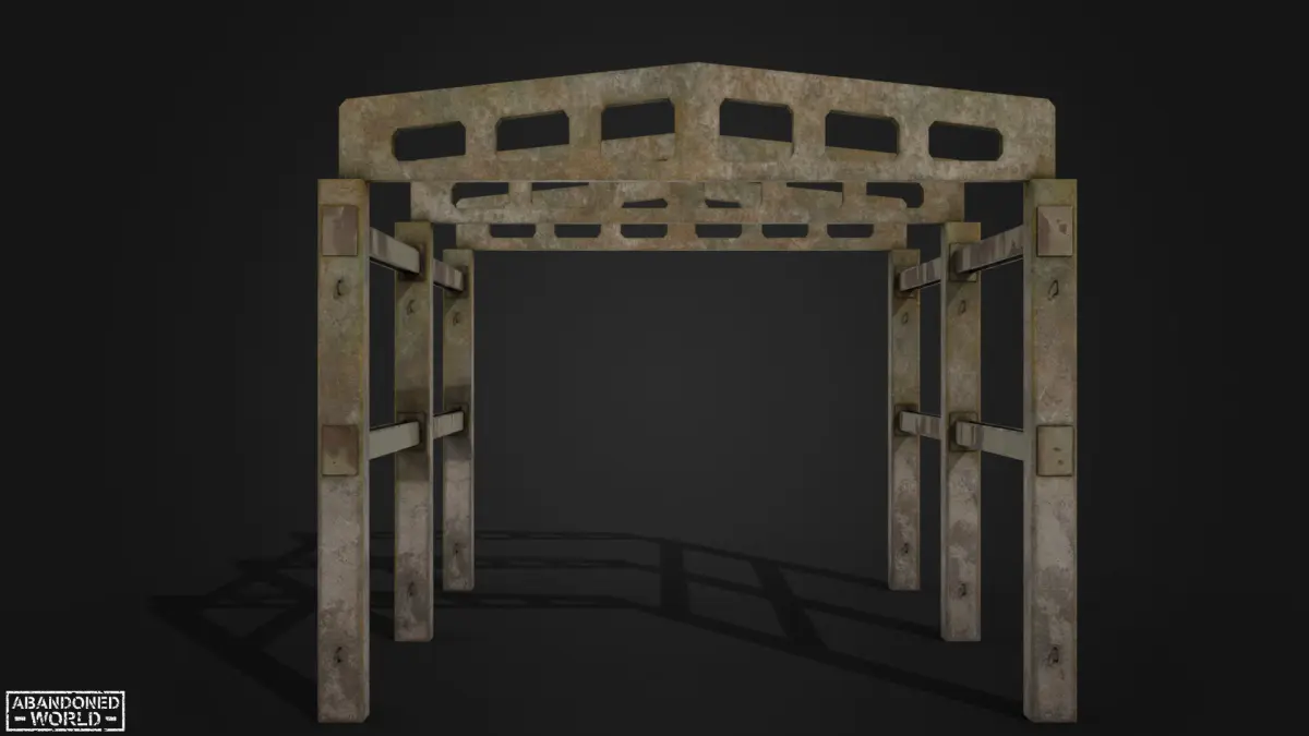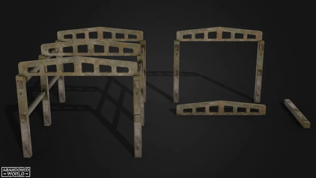 3D model of Abandoned Parts Of Hangar made in Game Ready. The set includes 2 models of hangar structures: concrete and metallic. They are the skeleton of a building without walls and a roof. For concrete, there are modular components, thanks to which it is possible to enlarge or rebuild this building. Perfect for the Unreal Engine and Unity.