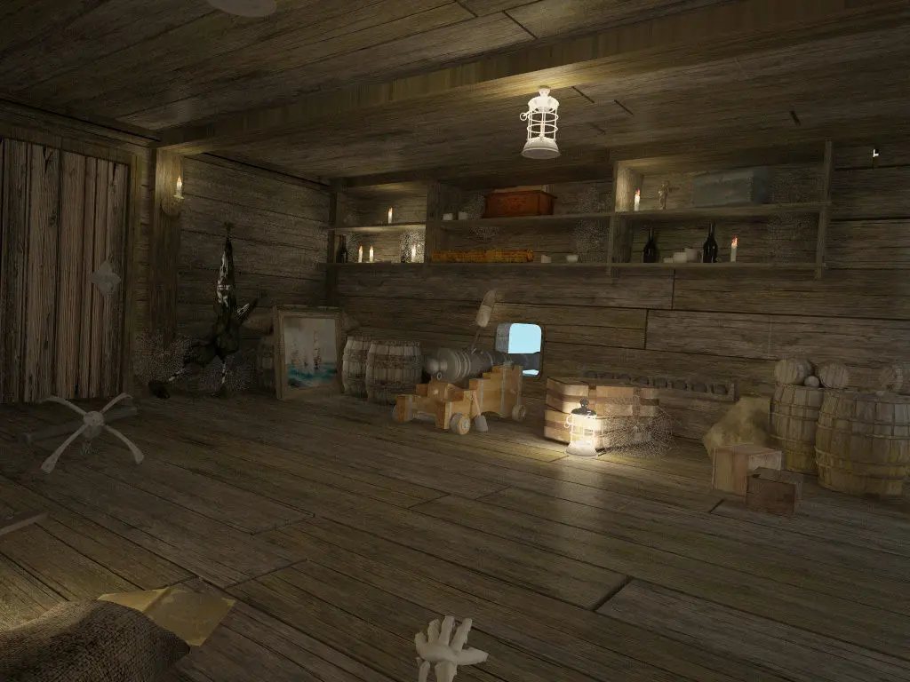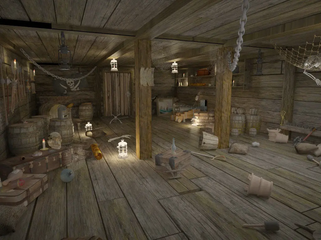 A cabin model of an abandoned pirate ship of the 18th century period with ancient weapons.Ancient objects used by pirates scattered randomly around the perimeter.Weapons of the 18th century are placed on the wall: halberd, ax, mace, pistol, sword, dagger, guns and nuclei.Along the perimeter are scattered old barrels, chests, boxes and various items of that time.The model is perfect for playing in the hidden object genre.