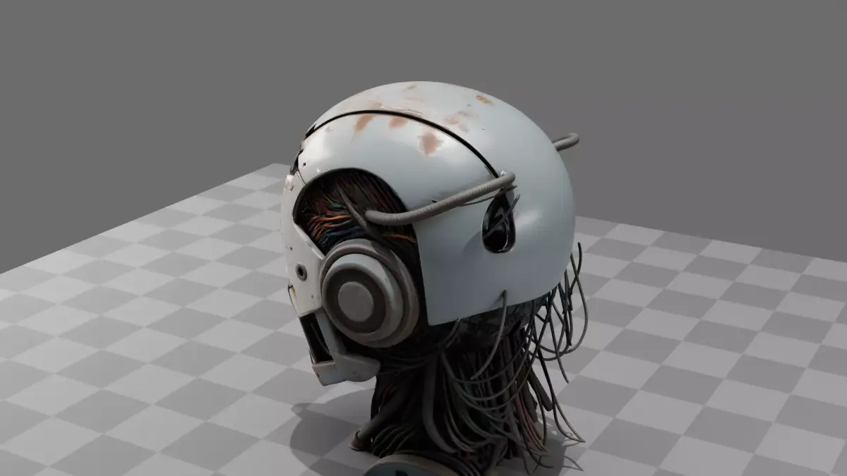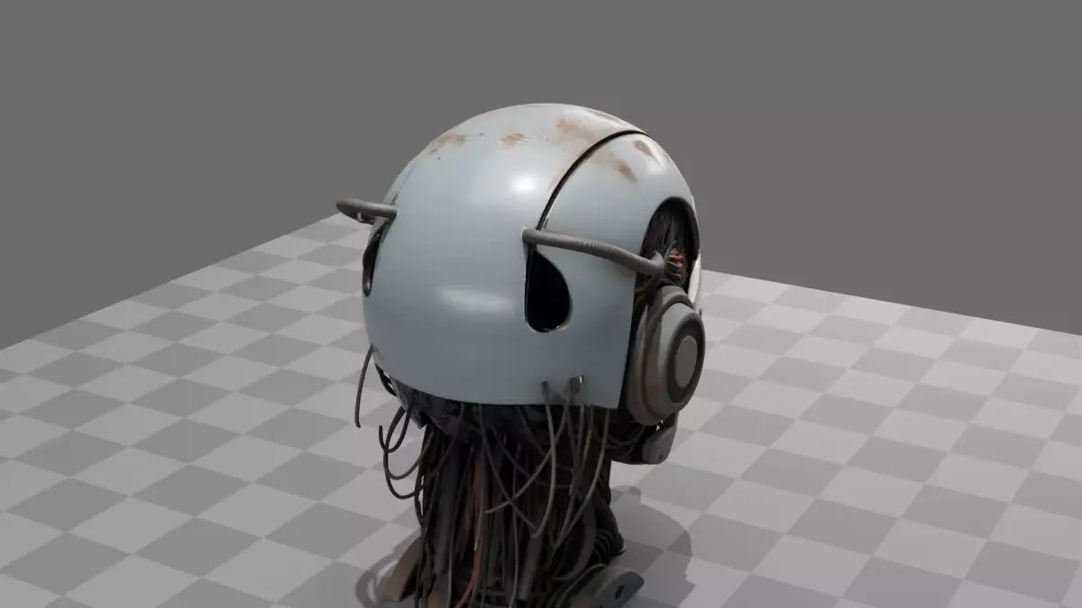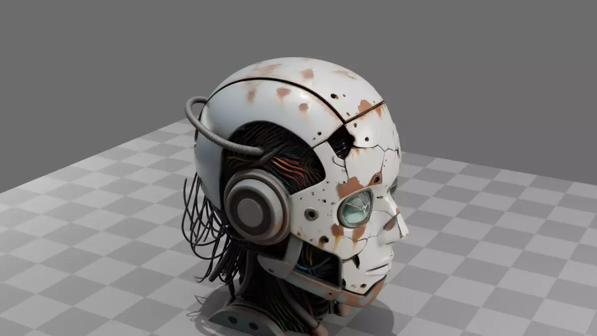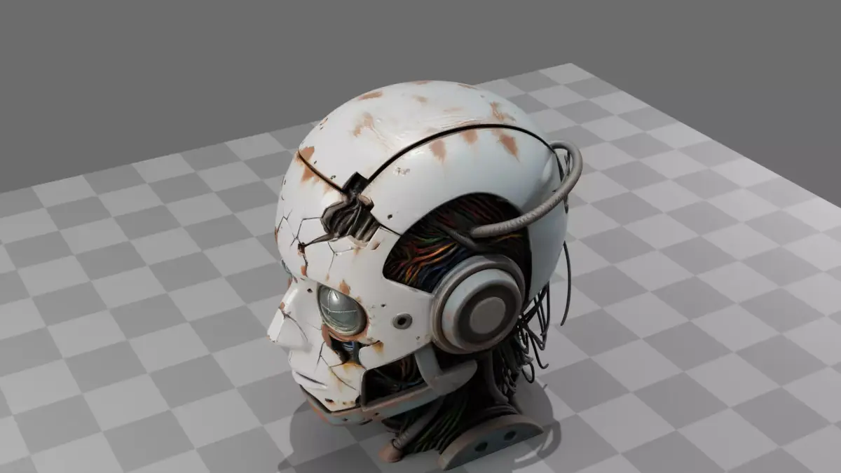 High-fidelity 3D model of an abandoned humanoid robot head at approximately 1.4m width, featuring damaged metal panels, exposed wiring, cracked optical lenses, dents, and corrosion weathering. The model includes 498,322 polygons with rusted metal, chipped paint, and glass materials with proper UV mapping for detailed surface definition. Supplied as a single object in GLB, OBJ, and BLEND formats. Suitable for game engines, VR/AR applications, architectural visualization, film and animation, and sci-fi environment asset libraries.
