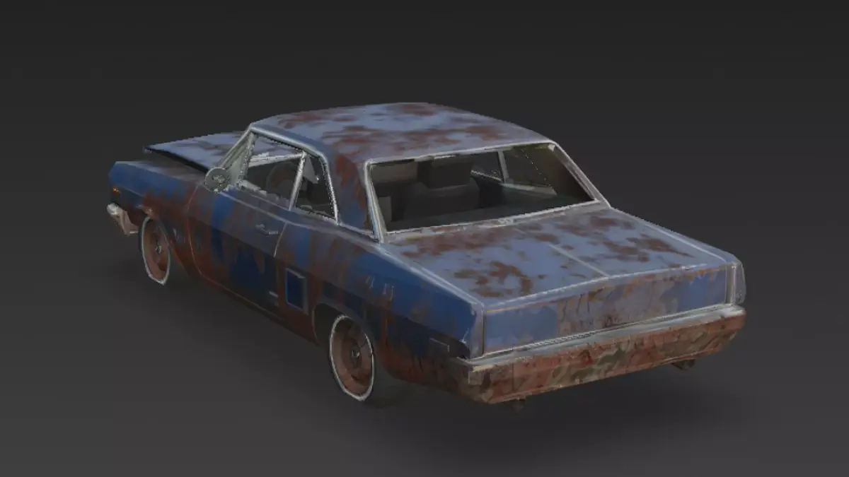 This is a highly detailed 3D model of an abandoned rusty sedan, perfect for creating realistic and atmospheric environments.The model showcases a weathered exterior, oxidized metal, and signs of long-term decay, making it ideal for post-apocalyptic scenes, urban ruins, or cinematic background assets.