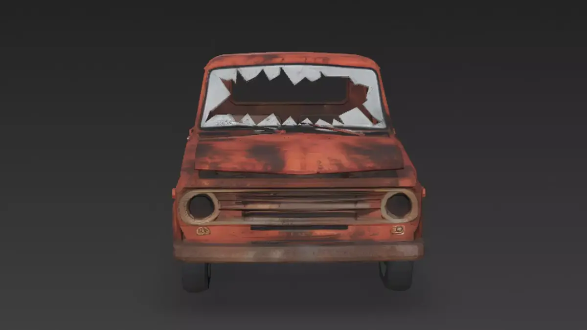 The model features a weathered body, oxidized surfaces, and signs of long-term wear, making it ideal for post-apocalyptic scenes, urban ruins, and cinematic backgrounds.