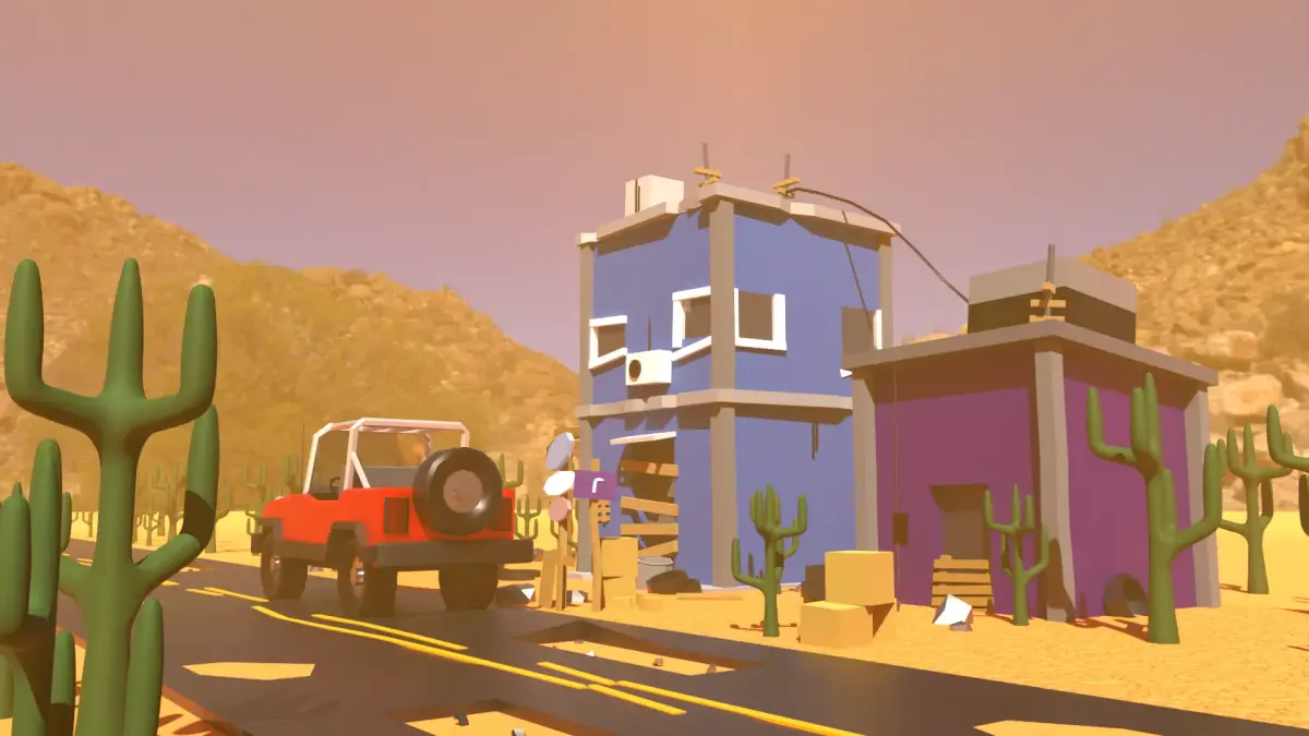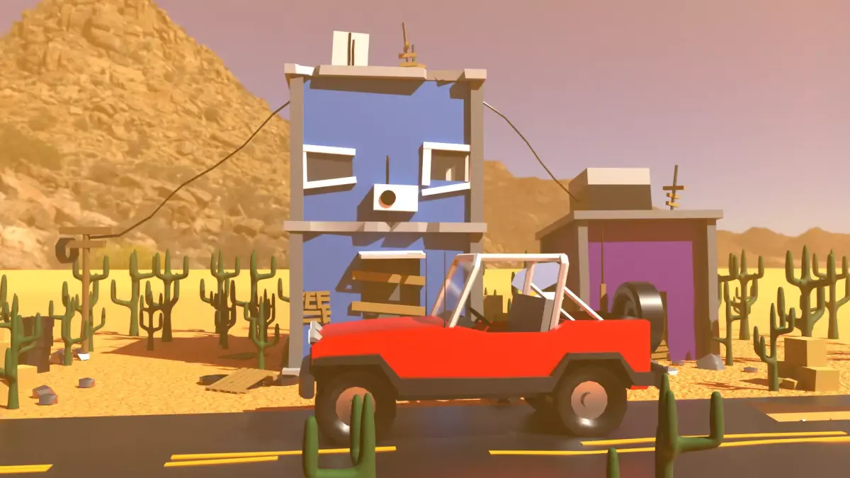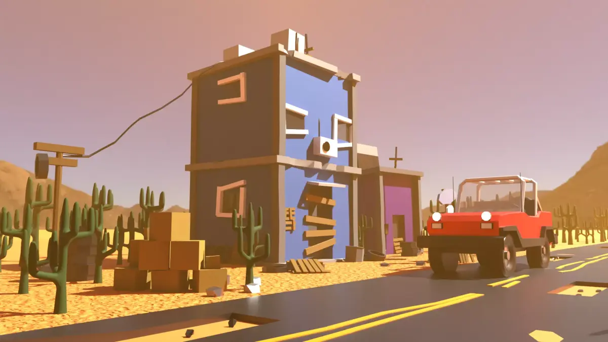 An old abandoned street club by the road with scattered boxes, rocks and wheels, one car, some pallets with cacti and road signs away from the power.