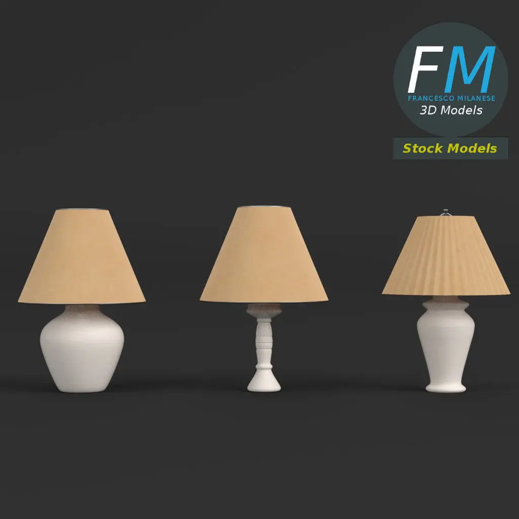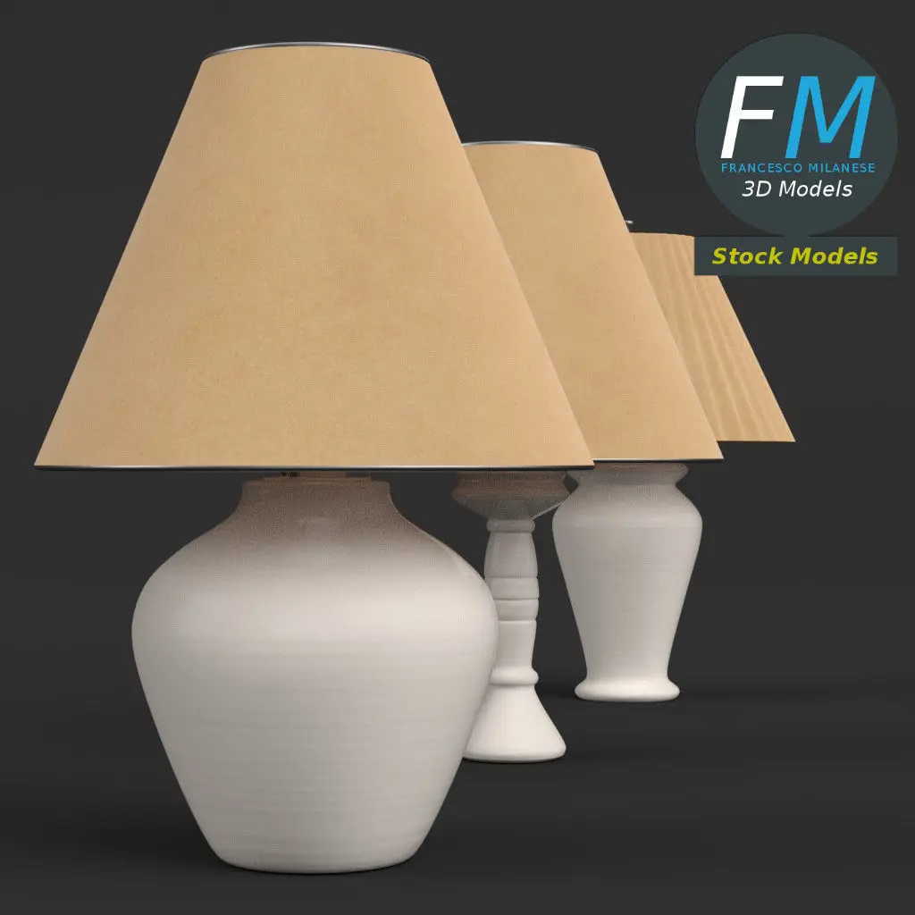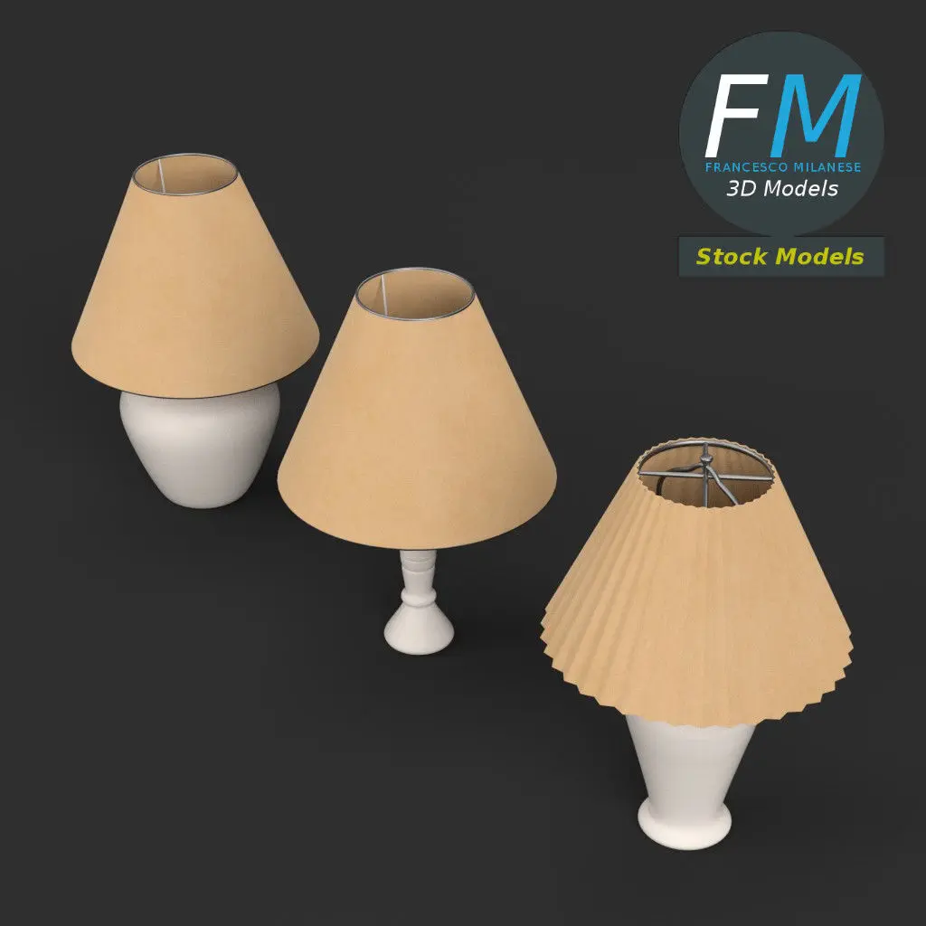 Abat-jours (3 lamps) 3D Models. 3 individual objects, each one with its own non overlapping UV Layout map, Material and PBR Textures set. Production-ready 3D Model, with PBR materials, textures, non overlapping UV Layout map provided in the package.