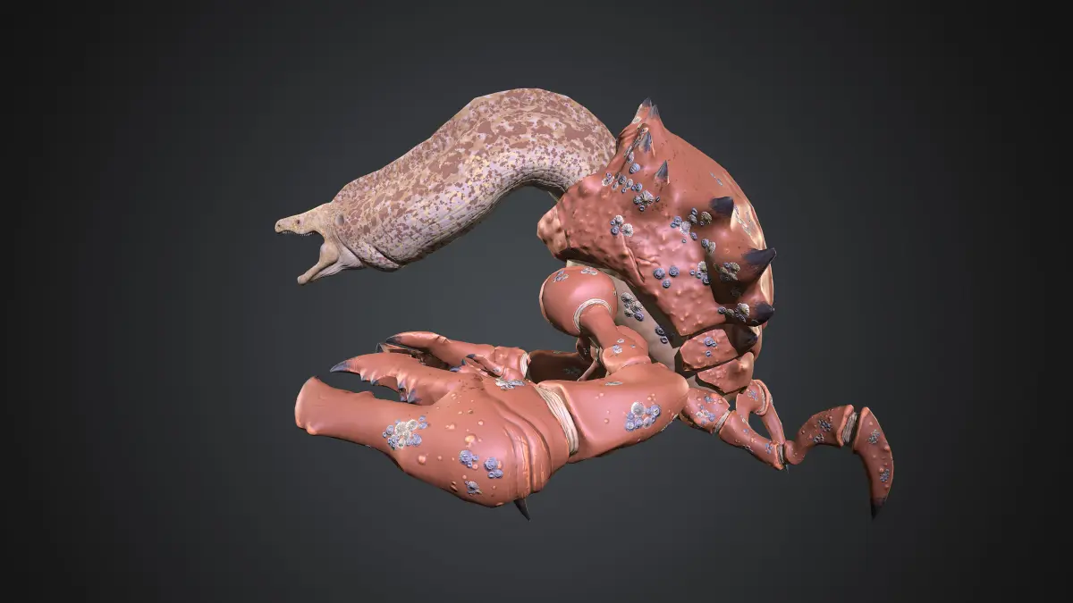 A mutation between a Moray eel and a Crab. I inspired when I watched the Caribean Pirates films, with one of their characters. The Moray head can go in and out of the body, like a turtle neck. The idea was to create an animal that has mutated out of two different species thanks to symbiosis. This model is good for using at games with mystical or mutant creatures as an acuatic enemy. Modeled in Blender, textured in Substance, Rigged and animated in Blender. It has only 1 simple animation of the Moray giving a bite.The model is completely functional and can be animated. The moray head and the crab body are 2 different objects, with their own rig and textures each one.18.330 faces. The whole body is rigged and ready to being animated. This model could be use as an enemy on a rpg or mmorpg game, or any game with a fantasy ambientation. As extra file, theres a Blender file with the model ready, and an extra difuse texture for the Moray head, which has darker yellow colors which maybe you like more :) Hope you like it!