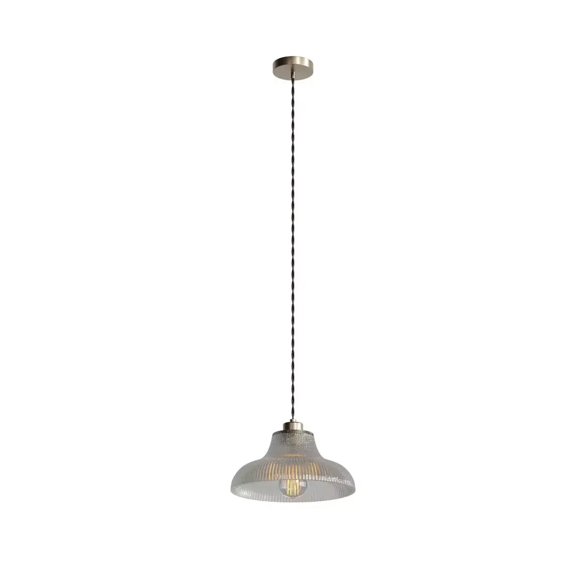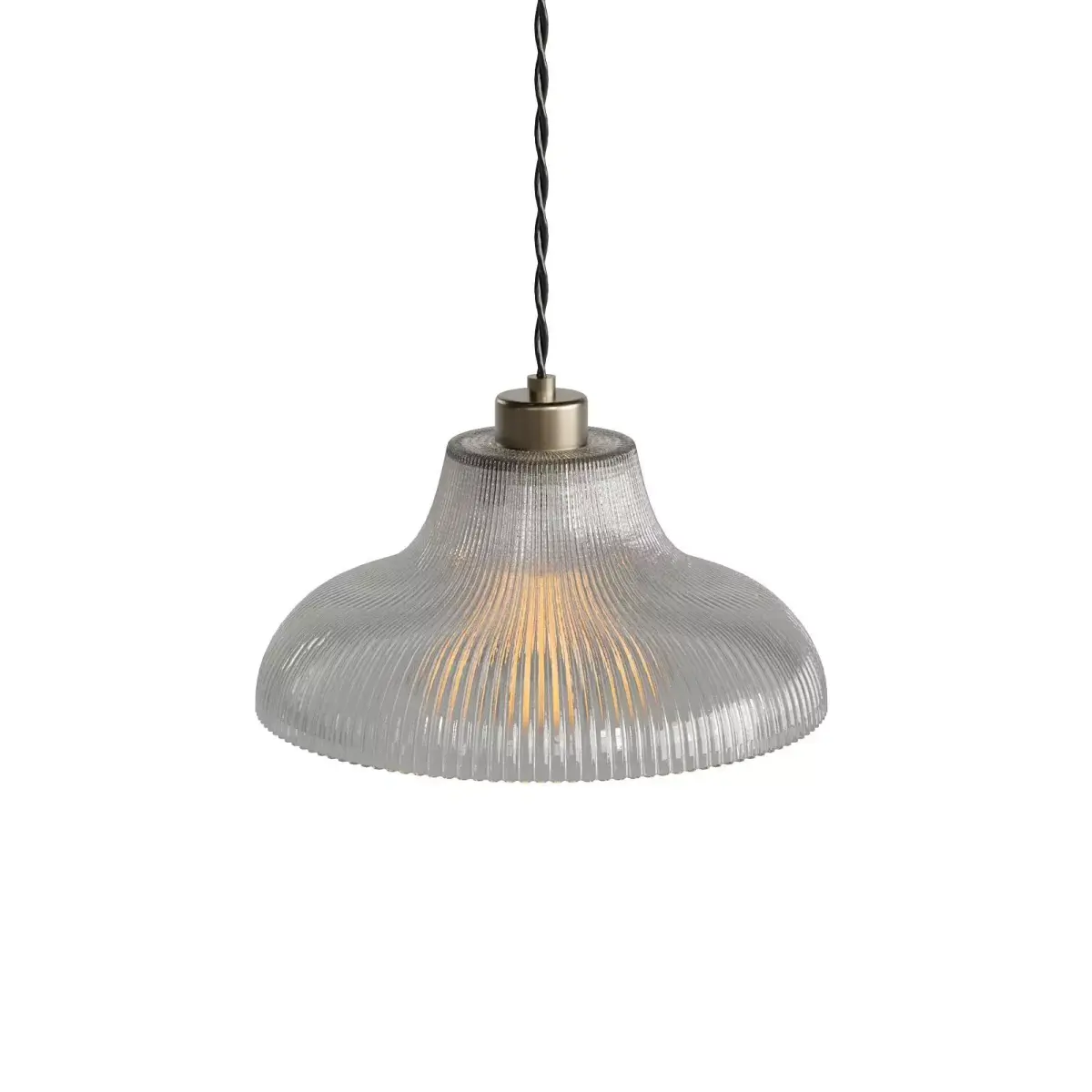 Dimensions: 7.1H x 11.8WMaterial: Brass, Glass, ribbed glassFinish: Antique BrassThe Abram Glass Pendant Light exudes modern industrial charm with its bold, streamlined design.