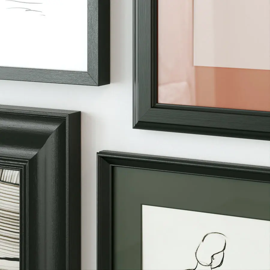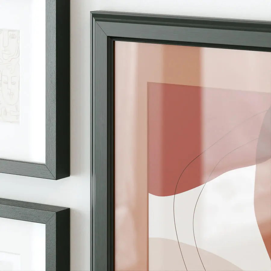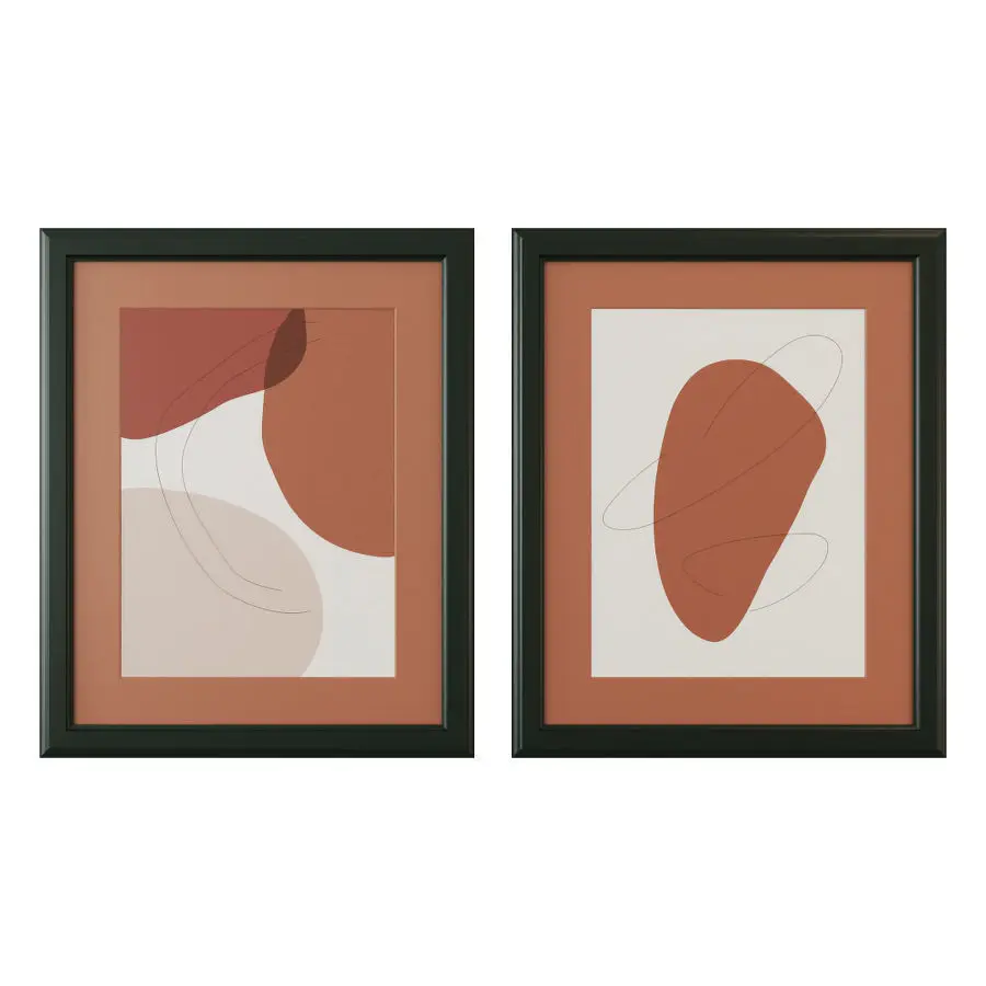 A set of abstract posters in dark wooden frames with passepartout.