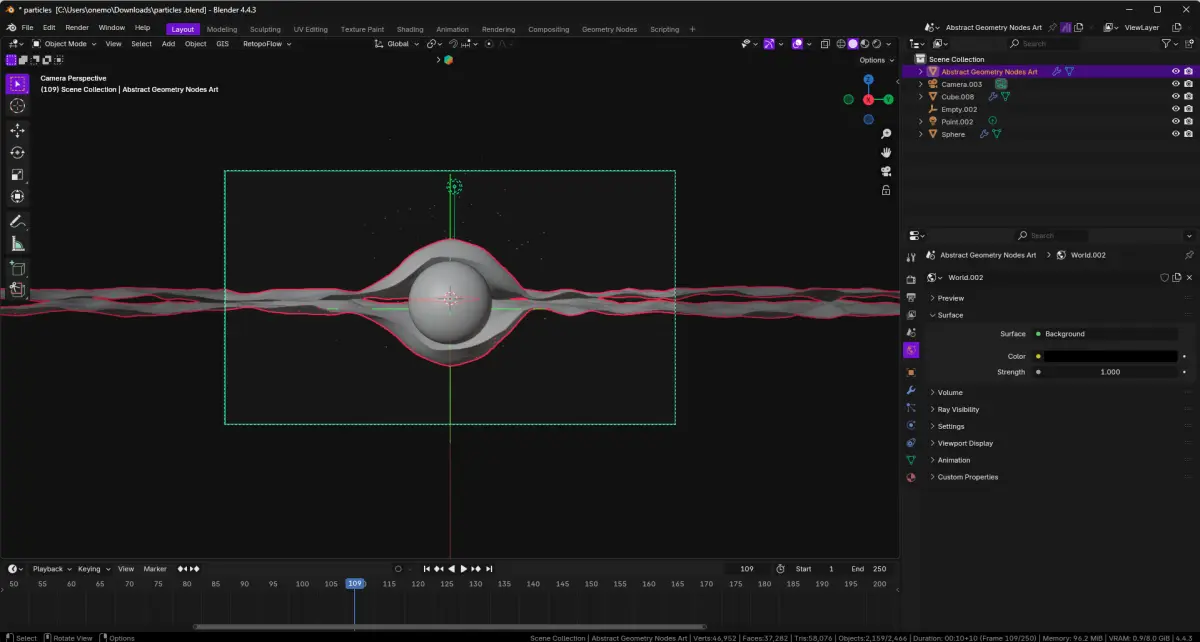 This captivating 3D render, created in Blender, showcases an abstract sci-fi energy field with a central glowing sphere. Surrounding the sphere are intricate, web-like structures, with a dynamic wave-like formation hovering above. The dark background, scattered with glowing particles, adds a mysterious, futuristic feel to the composition. A bright light source at the top enhances the otherworldly atmosphere, making it perfect for use in sci-fi projects, digital artwork collections, or as a striking visual element in creative designs.